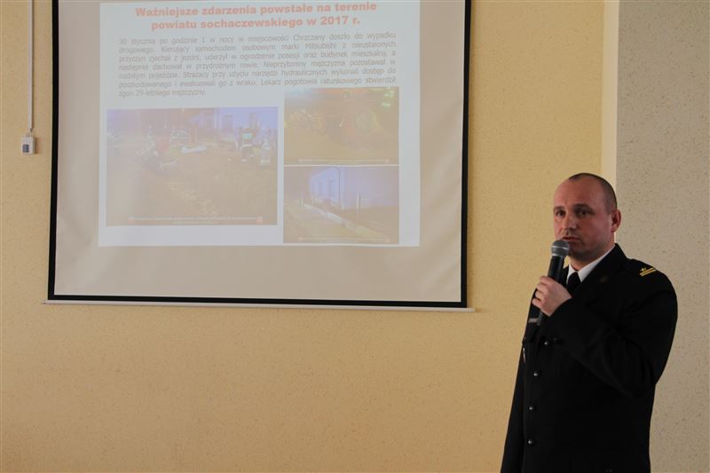 Strażacy z sochaczewskiej komendy min. Zastępca Komendanta Powiatowego PSP w Sochaczewie bryg. Mirosław Gorzki przedstawili informacje na temat najważniejszych zdarzeń, w których uczestniczyli. Zaprezentowano sprawozdanie z działalności, obejmujące zagadnienia operacyjne, kontrolno-rozpoznawcze, logistyczne i finansowe oraz dane statystyczne dotyczące liczby interwencji podejmowanych zarówno przez strażaków Powiatowej Państwowej Straży Pożarnej jak i Ochotniczych Straży Pożarnych. W 2017 roku odnotowano ogółem 1350 zdarzeń, które wymagały interwencji straży, z tego 447 wystąpiło na terenie miasta. 391 razy strażacy wyjechali do pożarów, 834 pomagali w miejscowych zagrożeniach takich jak zdarzenia w komunikacji drogowej, na obszarach wodnych, medyczne, budowlane, czy też będących skutkiem działania sił natury.