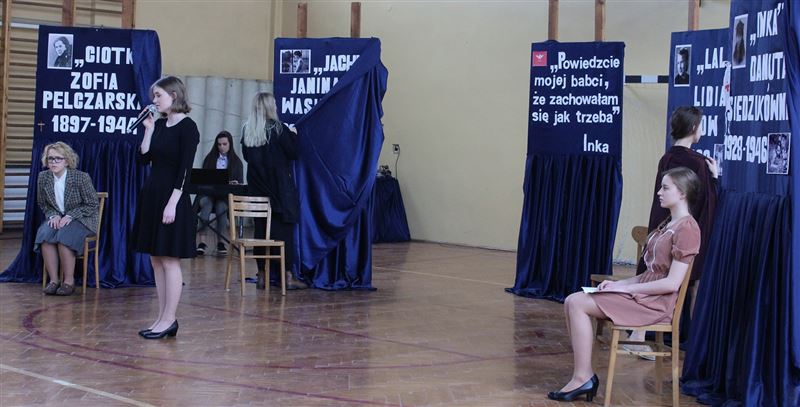 Niezwykle przejmujące kreacje Dziewczyn Wyklętych stworzyły: Daria Dudek, Klaudia Cieślak, Zuzanna Paduch i Barbara Mońka. Towarzyszyli im na scenie: Natalia Kapusta, Mateusz Witkowski, Jakub Niemyjski, Paweł Zatorski, Marcel Walczak, Jan Traczyk, Filip Chojnacki. Konferansjerami byli Daria Jaskółka i Adam Panasiuk. Usłyszeliśmy piosenkę w wykonaniu Julii Woźnickiej przy akompaniamencie Oli Adamczyk. W przygotowaniu spektaklu uczestniczyło jednak więcej osób i im także należą się słowa uznania. I tak reżyserem dźwięku był Jakub Górczyński. Dekoracje zaprojektowały i wykonały: Dagmara Walkowska, Klaudia Pętlak, Agnieszka Wujcik, Marta Łażewska i Katarzyna Matusiak. Scenariusz powstał staraniem Klaudii Cieślak, Darii Dudek, Bogusławy Górnickiej. Wreszcie wszystko fotografowała Dominika Zielińska. Pomysł i reżyseria to wspaniała twórcza praca w gronie bardzo zdolnych młodych ludzi, moich uczniów, z których jestem bardzo dumna.