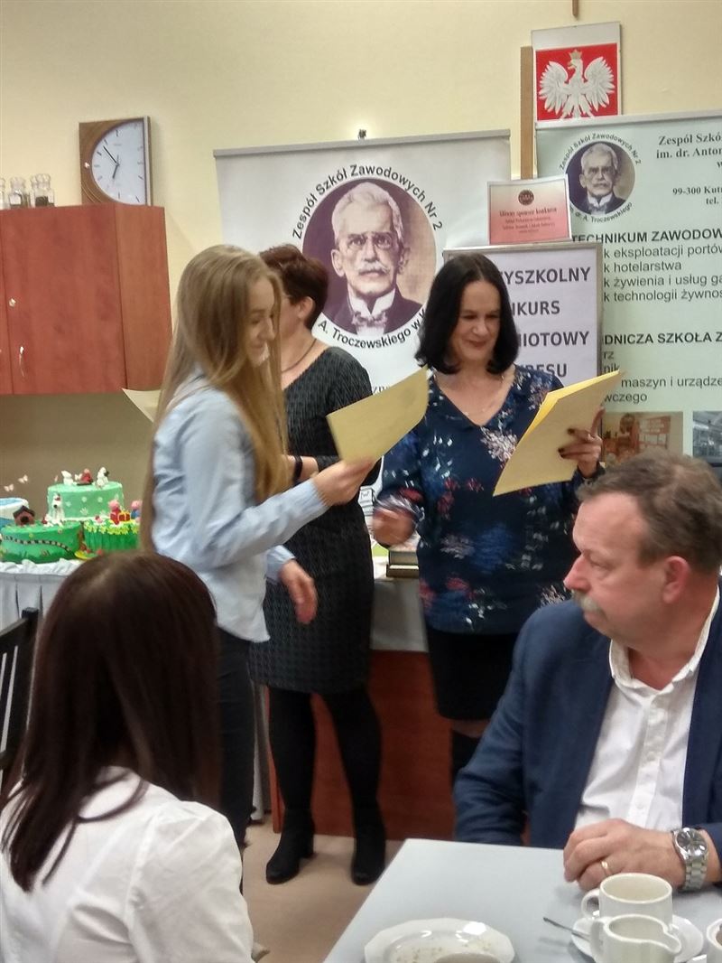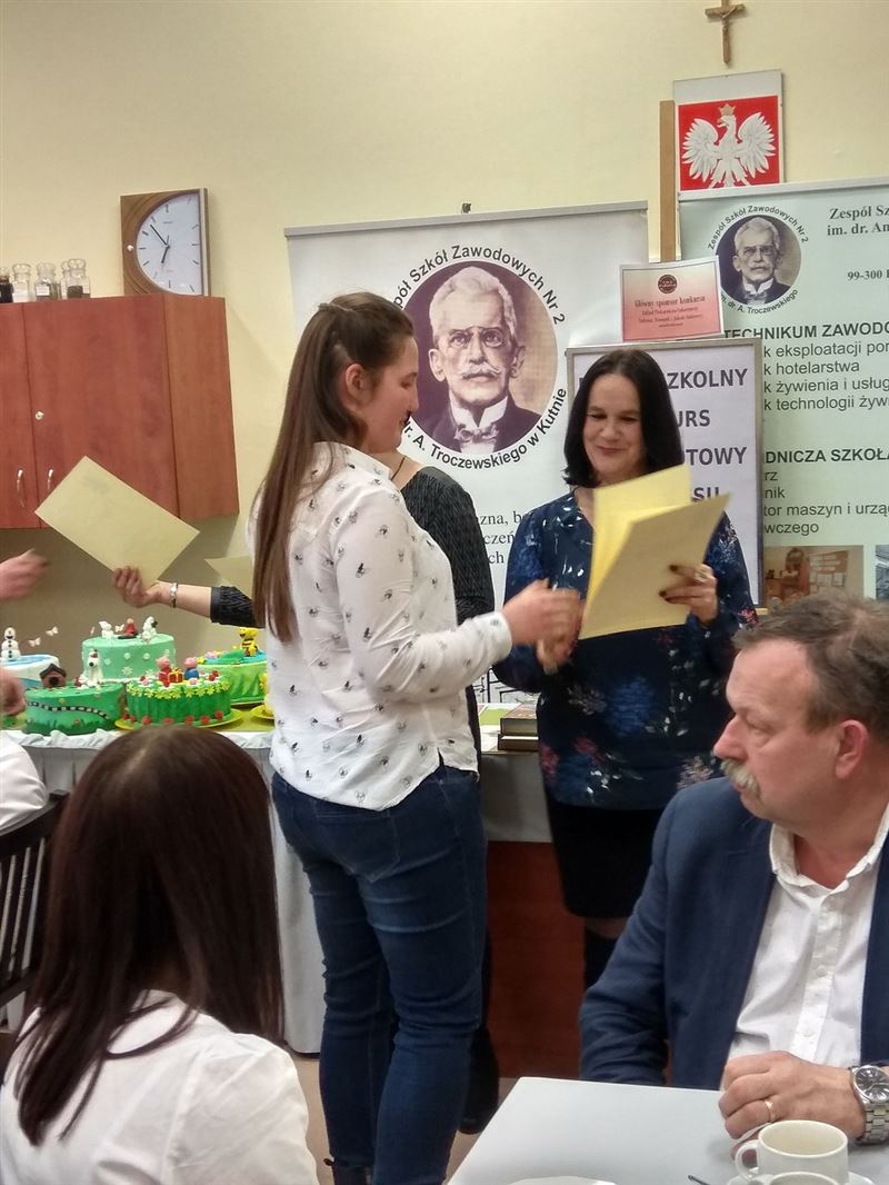 Uczniowie ZSR CKU w Sochaczewie uczestniczyli w „Międzyszkolnym Konkursie Przedmiotowym z Zakresu Żywienia Człowieka” w ZSZ Nr.2 w Kutnie. W tegorocznej edycji konkursu temat przewodni to dekorowanie wypieków cukierniczych z użyciem mas cukierniczych na temat: „Baje, bajki, bajeczki”. W czasie trwania konkurs gospodarze zorganizowali szkolenie i pokaz na temat technik wykonanie tortów malowanych. Sochaczewski „Ogrodnii” reprezentowały - Karolina Adamska i Angelika Kakareko, uczennice klasy 2 TŻb. Wykonały dekoracje tortu wykorzystując jako inspiracje bajkę „Reksio”. W zmaganiach konkursowych brało udział osiem grup dwuosobowych. Uczennice ukończyły konkurs zajmując III miejsce, gorąco gratulujemy!
