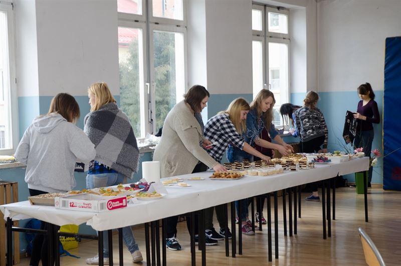 Grupa uczennic klas technikum przygotowała cieszący się bardzo dużą popularnością kiermasz sałatek i kanapek do pudełka, czyli „kolorowe, lekkie, zdrowe i pyszne posiłki”. Nie zabrakło też domowych słodkich wypieków. Uczestnicy akcji hojnie przekazywali dobrowolne datki, które zostaną teraz przekazane na rzecz wsparcia leczenia Magdaleny Rosa. Co ważne, tego dnia do szkoły przychodzili również inni absolwenci teresińskiej placówki, by wspólnie przyłączyć się do tej wspaniałej akcji. Nie zabrakło też gościa specjalnego, którym była mama naszej chorej absolwentki, będąca pod wrażeniem całej akcji.