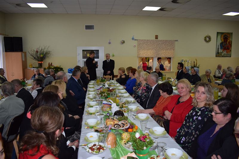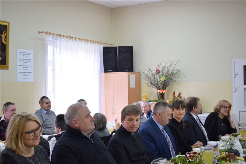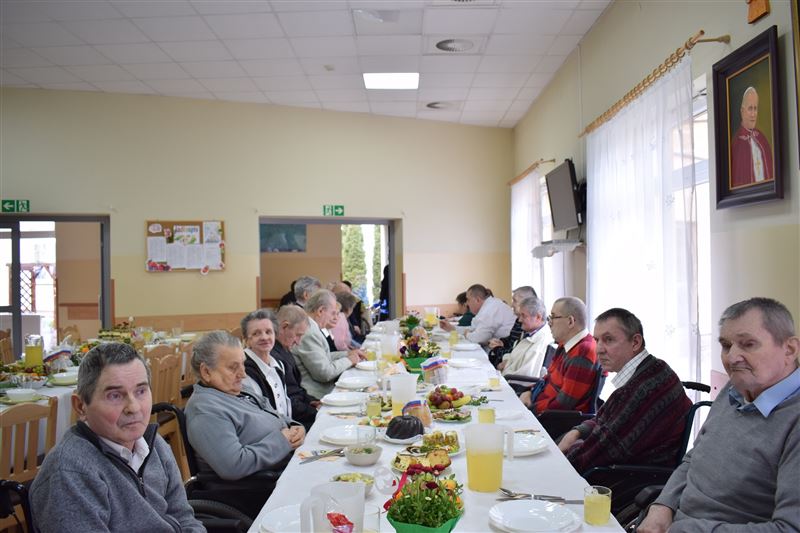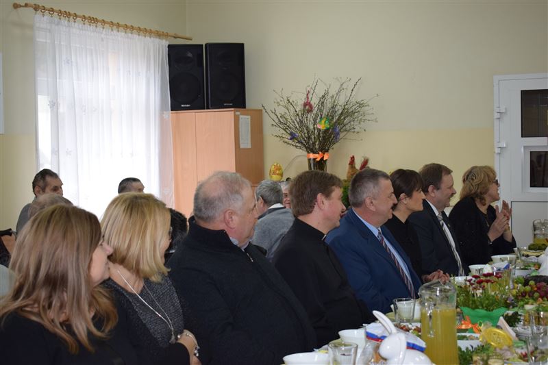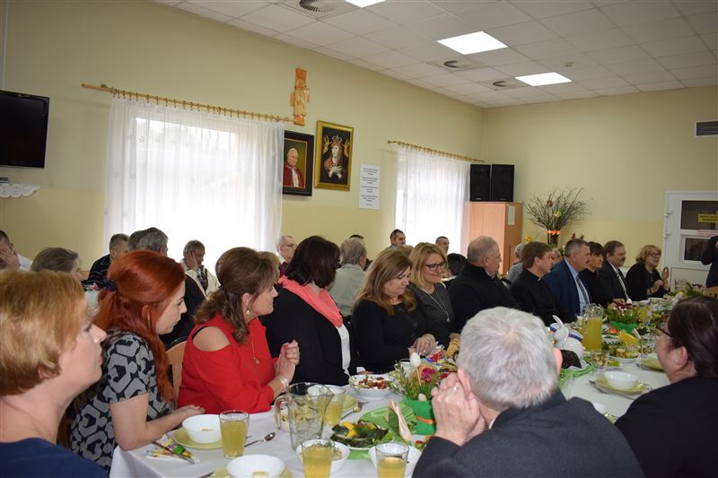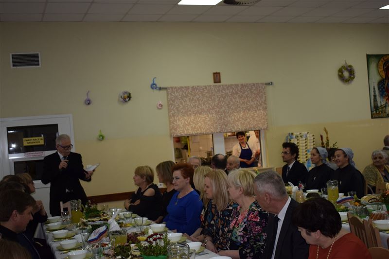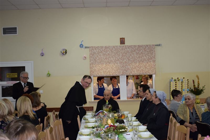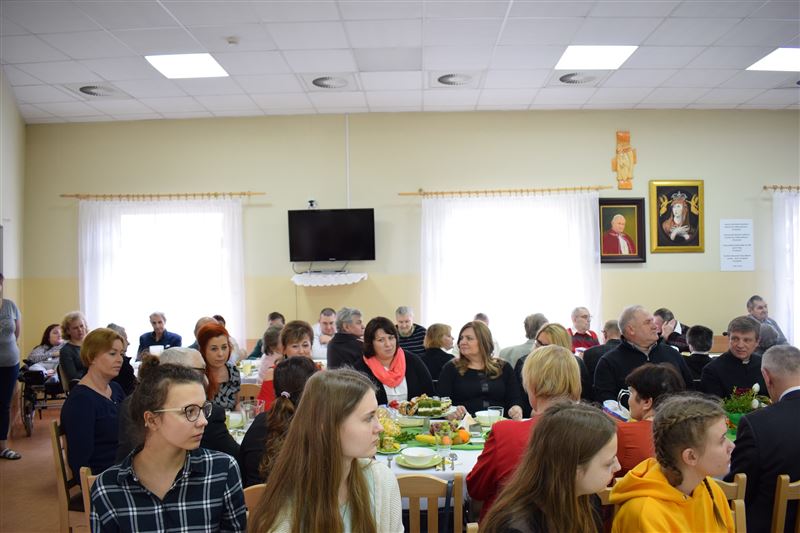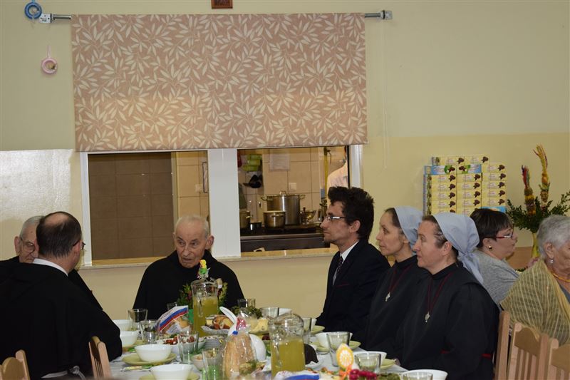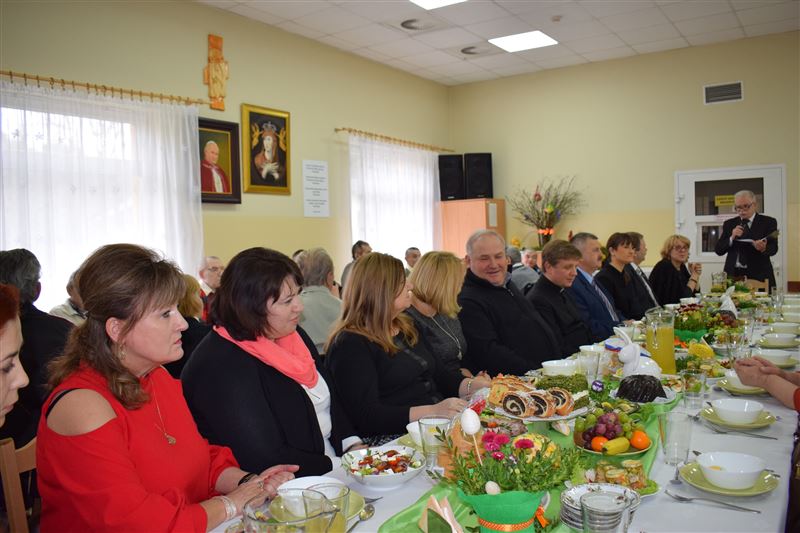 Wtorkowe popołudnie 27 marca br. na długo pozostanie w pamięci mieszkańców i pracowników Domu Pomocy Społecznej w Młodzieszynie, którzy uczestniczyli w uroczystym spotkaniu z okazji zbliżających się świąt Zmartwychwstania Pańskiego. To święto Wielkiej Nocy. Rozpoczynający się okres Wielkiego tygodnia zgromadził przy wielkanocnym stole wszystkich naszych przyjaciół księża – ks. proboszcz Dariusz Kuźmiński, s. Marietta Chlebus i s. Weronika Drozd oraz ojcowie i bracia z zakonu Ojców Franciszkanów w Niepokalanowie – o. Włodzimierz Machulak, br. Czesław Adamiak, br. Feliks Grabowiec. Swoją obecnością zaszczycili nas także: Jolanta Gonta – starosta sochaczewski, Tadeusz Głuchowski – wicestarosta, wiceprzewodniczące Rady Powiatu - Monika Wideńska, Wanda Dragan, a także Andrzej Grabarek, Bożena Samson – członkowie Zarządu Powiatu, Katarzyna Kajak – dyrektor Powiatowego Centrum Pomocy Rodzinie, Monika Pietrzyk – wójt Gminy Młodzieszyn, Joanna Kamińska – naczelnik Wydziału Polityki Społecznej i Ochrony Zdrowia Urzędu Miasta Sochaczew, Agnieszka Ambroziak – dyrektor Młodzieżowego Ośrodka Wychowawczego w Załuskowie, Beata Duda – zastępca dyrektora Młodzieżowego Ośrodka Wychowawczego w Załuskowie, Teresa Michałowska – dyrektor Dziennego Domu Pomocy Społecznej w Sochaczewie, Małgorzata Malczewska – dyrektor Szkoły Podstawowej w Młodzieszynie, Jolanta Bednarek – zastępca dyrektora Szkoły Podstawowej w Młodzieszynie, Krzysztof Sieczkowski – dyrektor Zakładu Komunikacji Miejskiej w Sochaczewie, Marta Fotruna – starszy inspektor w PCPR Sochaczew, Zofia Miszczak – dyrektor Miejskiego Przedszkola nr 7 im. Marii Montessorii w Sochaczewie, Paweł Orliński – przedstawiciel Rodzin Katolickich w Młodzieszynie, Sylwia Błaszczak – katechetka ze Szkoły Podstawowej w Młodzieszynie wraz z młodzieżą.