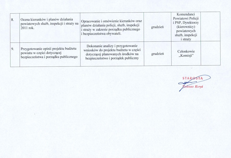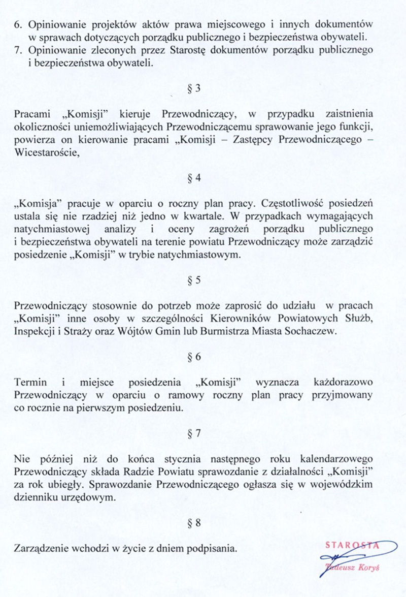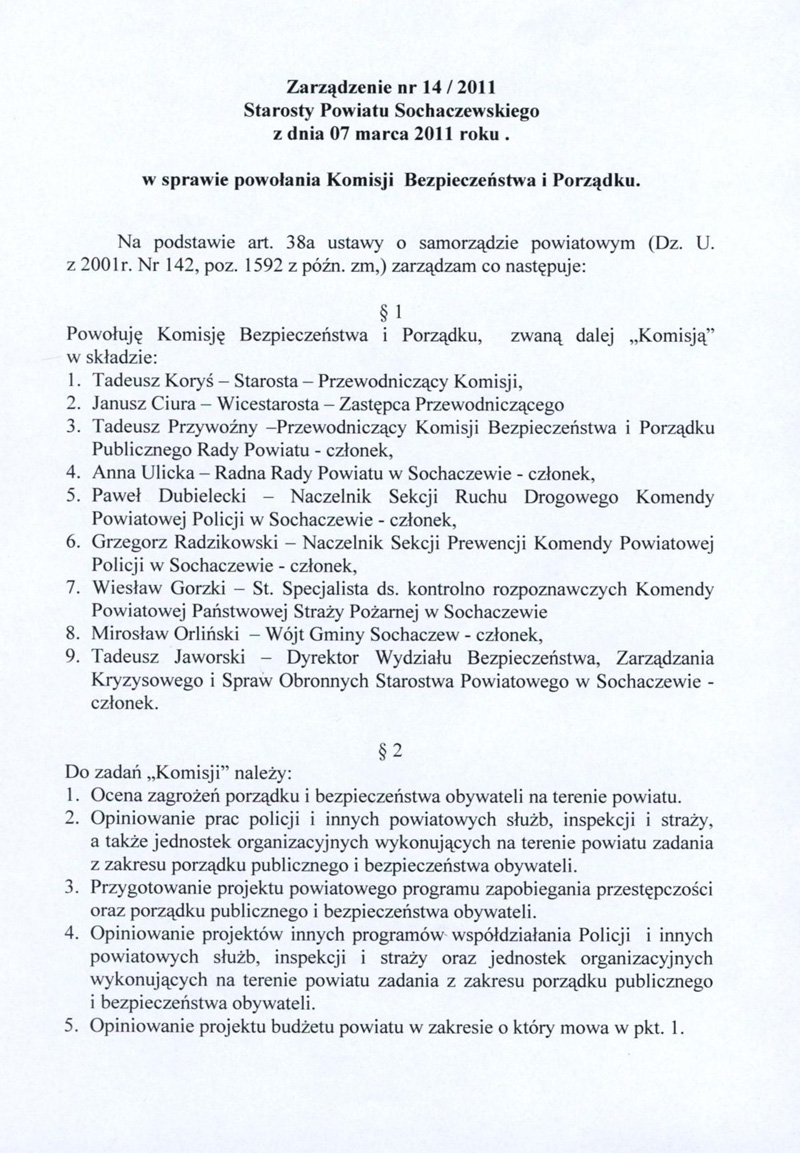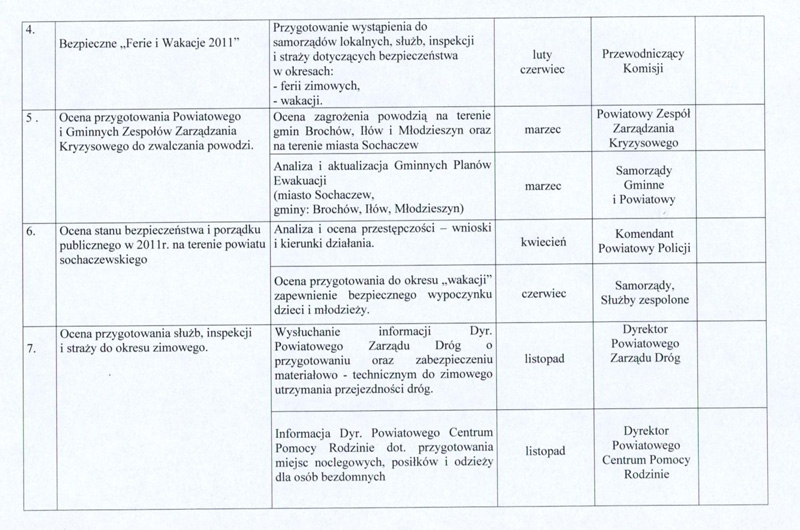 Starosta sochaczewski Tadeusz Koryś jako przewodniczący, powołał Zarządzeniem nr. 14/2011 Starosty Powiatu Sochaczewskiego z dnia 07.03.2011 Komisję Bezpieczeństawa i Porządku w składzie: wicestarosta Janusz Ciura, przewodniczący Komisji Bezpieczeństwa i Porządku Publicznego Rady Powiatu Tadeusza Przywoźnego, radnej powiatu - Anny Ulickiej, Pawła Dubieleckiego – Naczelnika Sekcji Ruchu Drogowego KPP w Sochaczewie, wójta Gminy Sochaczew Mirosława Orlińskiego, Dyr.Wydziału Bezpieczeństwa, Zarządzania Kryzysowego i Spraw Obronnych - Tadeusza Jaworskiego, Naczelnika sekcji prewencji KPP - Grzegorza Radzikowskiego oraz Starszego specjalisy ds. kontrolno rozpoznawczych KPP Straży Pożarnej w Sochaczewie - mł. bryg. mgr inż. Mirosława Gorzkiego, a także pracownika Wyd. Zarządzania Kryzysowego i Spraw Obronnych - Przemysława Zielińskiego, której pierwsze posiedzenie odbyło się dnia 27.04.2011 roku. Na posiedzeniu omówiono organizację i zadania Komisji Bezpieczeństwa i Porządku starosty sochaczewskiego. Poruszono sprawy terenów najbardziej zagrożonych powodziami oraz stany dróg powiatowych. Uwzględniono realizację zadań starosty w zakresie zwierzchnictwa nad powiatowymi służbami, inspekcjami i strażami oraz zadania określone w ustawach w zakresie porządku publicznego i bezpieczeństwa obywateli. Do porządku obrad należało przedstawienie sprawozdania z działalności komisji z 2010 roku. Poruszano kwestję 3 gmin położonych nad Wisłą, które potrzebują szczególnej uwagi z racji usytuowania, co kwalifikuje te tereny do najbardziej zagrożonych. Starosta Tadeusz Koryś poinformował o zorganizowanej przez wojewodę mazowieckiego konferencji na temat uregulowania rzeki Wisły w jej środkowej części, której zadaniem jest przyczynić się do zmniejszenia zagrożeń powodziowych. Powstał zespół roboczy do prac, które na 2-dniowej konferencji wypracował wiele rozwiązań, poruszono tematy zapory włocławskiej, spłycania dna Wisły, jej odmulania, oczyszczania oraz utylizacji zanieczyszczeń. Sprawy obrad doknęły również tematu ewakuacji ludności i zwierząt podczas ubiegłoroczej powodzi w obrębach zagrożonych gmin, szczególnie gminy Iłów. Komisja oceniała również zagrożenia porządku publicznego i bezpieczeństwa obywateli na terenie powiatu, gdzie podziękowano za duże zaangażowanie wójtowi Mirosławowi Orlińskiemu za jego wkład przy ratowaniu dóbr kultury w związku z zagrożeniem, które pojawoło się podczas ubiegłoroczej powodzi na terenach parku Fryderyka Chopina w Żelazowej Woli w skutek długo utrzymującego się wysokiego stanu wody w rzece Utracie. Uwzględniono również temat szkód w gminach, które znalazły się na liście wojewody mazowieckiego do uzyskania środków finansowych na odbudowę zniszczeń popowodziowych dla gmin w których są zastosowane specjalne zasady odbudowy zniszeczeń. Starosta poinformował o wynikach prac komisji powiatowej ds. szacowania zniszczeń powodziowych. Uzyskano na ten cel 400 tys. zł. dotacji ze szczególnym uwzględnieniem trasy Władysławów – Piotrkówek, do której w najbliższych dniach zostanie rozstrzygnięty przetarg na wykonawcę. „Staramy się przystępować z rozwagą do przetargów, a dobór wykonawców nie jest łatwy ze względu na ograniczone możliwości firnanoswe, jednakże liczymy na pomyślność i jak najlepsze spożytkowanie otrzymanych środków tak aby każda złotówka miała pokrycie w zabezpieczeniu naszego powiatu” zapewniał obecny starosta.