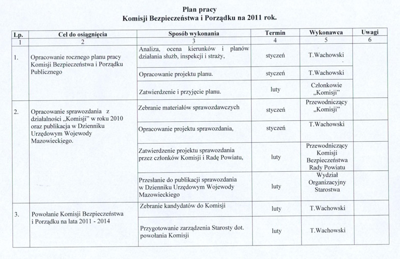 Komisja pracuje według ustalonego i zatwierdzonego na posiedzeniu, rocznego planu pracy, który uwzględnia wszystkie ustawowo określone cele i zadania. Między innymi dotyczy on opiniowania i przygotowania kierunku działań policji i innych powiatowych służb, inspekcji i straży, a także jednostek organizacyjnych wykonujących na terenie powiatu zadań w zakresie porządku publicznego i bezpieczeństwa obywateli. Przygotowywanie i zatwierdzanie powiatowego programu zapobiegania przestępczości, jak i bezpieczeństwa obywateli oraz opiniowanie projektów innych programów. Współdziałania policji z innymi powiatowymi służbami dotyczącymi bezpiecznych wakacji oraz przygotowania do zimy to klika z aspektów planu pracy. Opiniowanie projektu budżetu powiatu w zakresie bezpieczeństwa i porządku publicznego, oraz innych lokalnych akcji, przedsięwzięć i programów mających na celu poprawę bezpieczeństwa publicznego. Dyr. Tadeusz Jaworski szczególny nacisk kładł na zorganizowanie kolejnego spotkania w czerwcu w celu omówienia spraw związnych z wakacyjnym okresem bezpieczeństwa na drogach oraz w miejscach wypoczynku letniego dzieci i młodzierzy. Komisja jest skutecznym narzędziem zarządzania bezpieczeństwem i ma za zadanie przewidywanie isniejących zagrożeń, zapobieganie nowym a spotkania mają na celu zapewnić, że wszystkie kwestie zostaną rozwiązane i powiat będzie coraz bardziej bezpieczny.