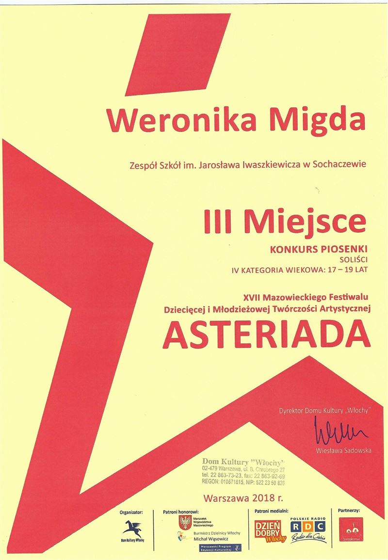 Po raz kolejny możemy się pochwalić sukcesami uczennicy klasy II technikum organizacji reklamy Weroniki Migdy, która reprezentuje naszą szkołę na różnych konkursach wokalnych. Ostatnio do kolekcji nagród dodała kolejne sukcesy. Zajęła I miejsce na V Sochaczewskim Festiwalu Poezji i Pieśni Patriotycznej z utworem „Lilu-walczyk”. Weronika wzięła również udział w XVII Mazowieckim Festiwalu Dziecięcej i Młodzieżowej Twórczości Artystycznej „Asteriada”, w którym zdobyła III miejsce. Sukces przyniosło jej wykonanie piosenki Ani Szarmach pt. „Dlaczego”. Gratulujemy!