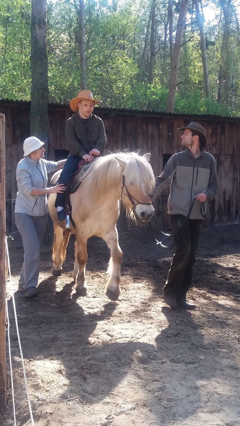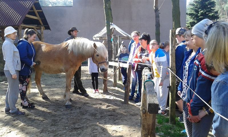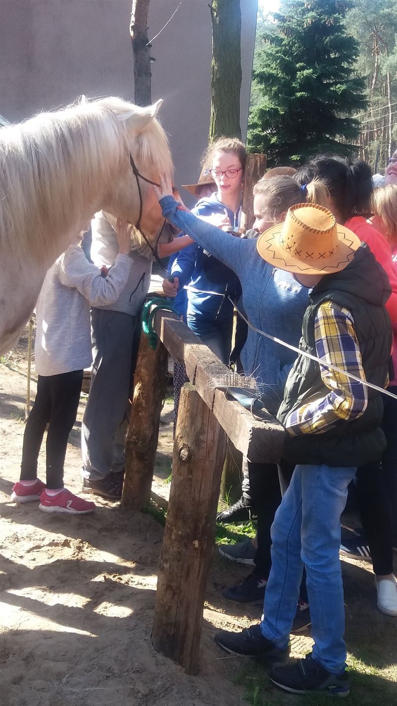 Nasz plan zajęć tego dnia, to wypełnione atrakcjami chwile. Rozpoczęliśmy od zajęć teoretycznych w stajni na temat koni – dzieci poznały zwyczaje i sposób życia koni, zapoznały się ze sprzętem jeździeckim i z rolą konia we współczesnym świecie. Samodzielne nawiązywały kontakt z końmi. Każde dziecko samo lub z pomocą mogło spróbować: przygotować konia do jazdy, wyczyścić, pogłaskać, nakarmić. Chwilą dla odważnych była przejażdżka na koniu. Okazało się, że mamy bardzo wielu bohaterskich uczniów. Dzieci wiedziały, że konie są spokojne i bezpieczne, przygotowane do pracy z dziećmi (pracują przecież w hipoterapii).