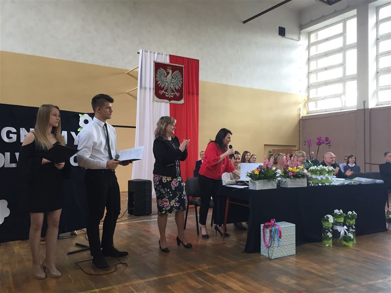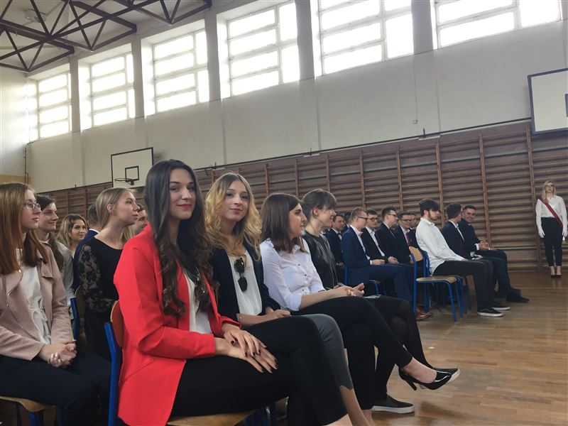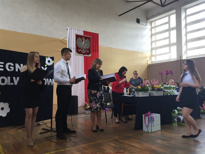Najpierw jednak odebrali świadectwa ukończenia szkoły. Ci z najlepszymi wynikami – 8 osób -świadectwa z paskiem, oni uzyskali średnią ocen minimum 4,75, do tego wymagane jest wzorowe zachowanie. Osiem osób otrzymało takie świadectwa z rąk dyrektor szkoły Julii jakubowskiej. W Liceum Ogólnokształcącym: Sebastian Szymański – średnia ocen 5,00 i Aleksandra Gala średnia ocen 4,89. W Technikum 6 osób odebrało świadectwa z paskiem: Michał Kowalski (średnia ocen 4,96), Łukasz Skorupa (4,93), Karolina Filipowicz (4,767), Sandra Matych (4,967), Aleksandra Piotrowska (4,793) i Damian Baczyński (4,93). Obecna na uroczystości Urszula Opasiak dyrektor Powiatowego Zespołu Edukacji wręczyła 3 osobom nagrody Starosty Powiatu Sochaczewskiego. Jak zawsze przy takiej okazji były kwiaty, podziękowania, ciepłe słowa od maturzystów oraz życzenia od tych, którzy za rok będą zdawać maturę.