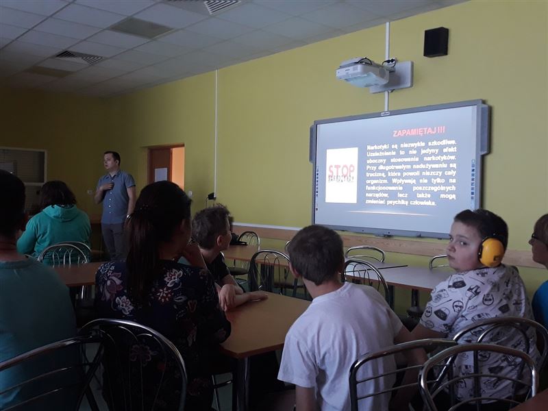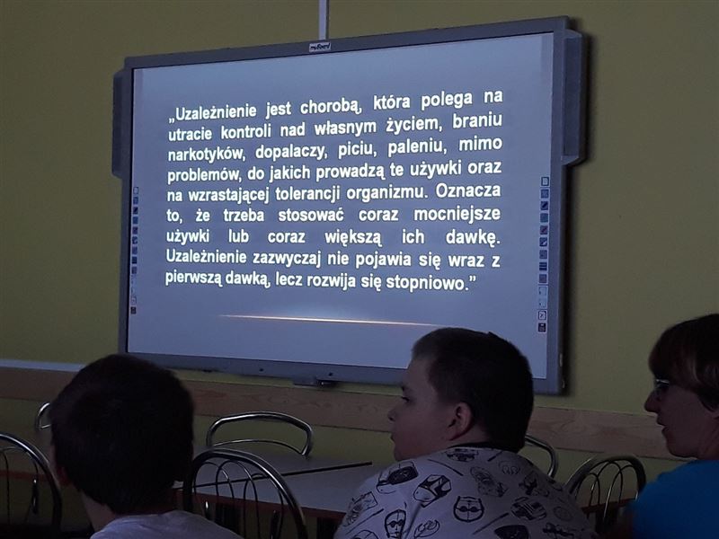 Ciekawie przygotowana prezentacja, wyjaśnienia i komentarze specjalisty oraz animacje pozwoliły uczniom poznać niebezpieczeństwa alkoholizmu, narkotyków i środków zastępczych, cybernałogów.