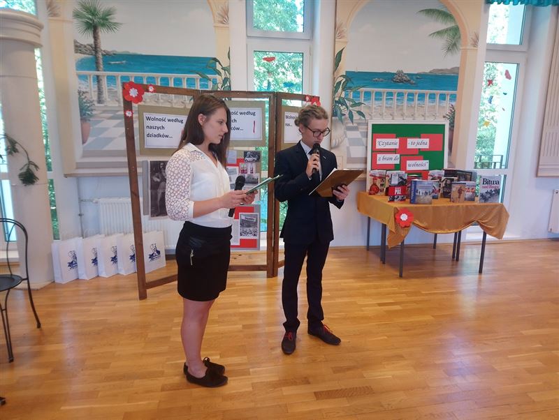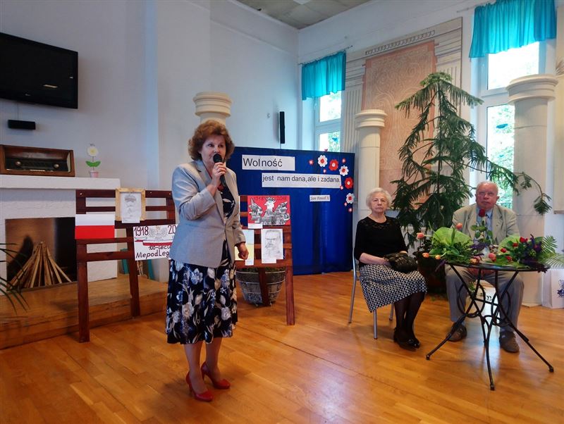 Dyrektor Ewa Odolczyk w swoim wystąpieniu podkreśliła, że Polska to wolny, niepodległy kraj, bezpieczny dla nas Polaków dom i powinniśmy w codziennym życiu przestrzegać wartości patriotycznych. Podkreśliła także, jak ważną rolę pełni pozyskiwanie informacji od ludzi pamiętających wydarzenia historyczne, ale także literatura poruszająca tematykę niepodległościową. Dyrektor zachęcała uczniów do zapoznania się z wyeksponowanymi książkami zakupionymi z Narodowego Programu Rozwoju Czytelnictwa i korzystania ze zbiorów biblioteki szkolnej.
