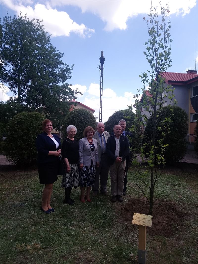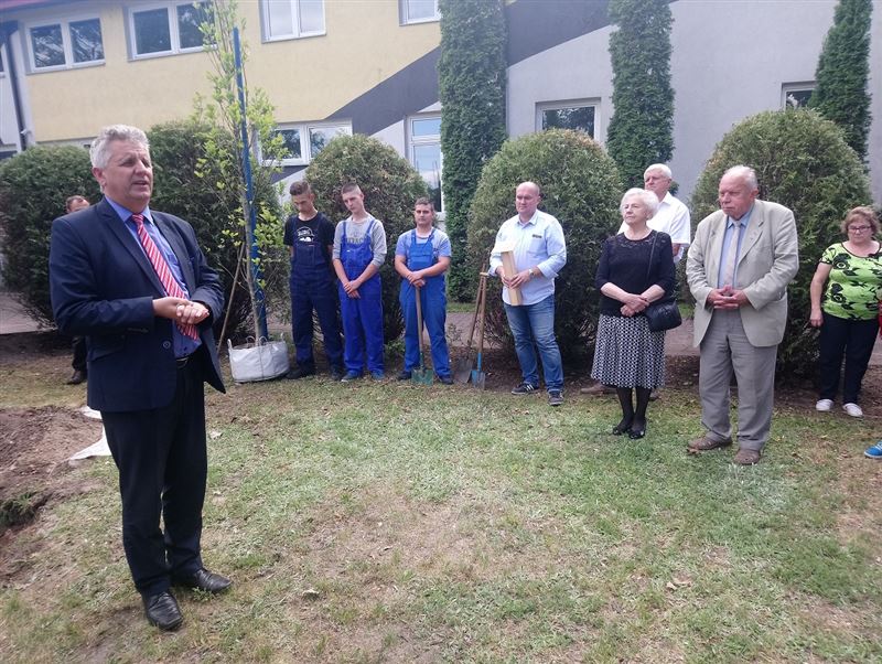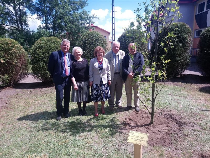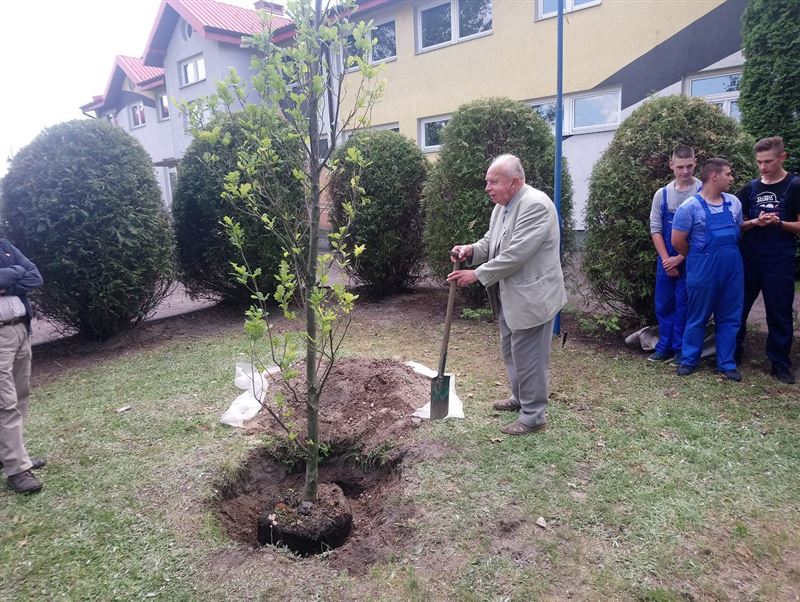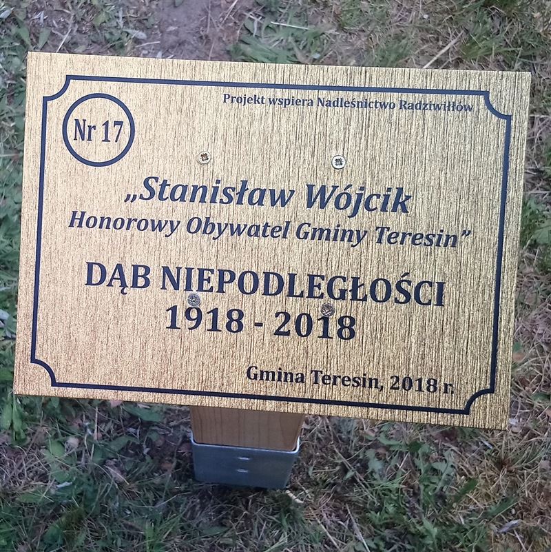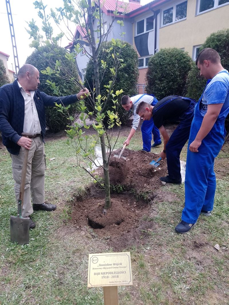W kolejnej części obchodów, na placu przed budynkiem szkoły, uczestniczyliśmy w zasadzeniu dębu. Drzewko zostało poświęcone śp. Stanisławowi Wójcikowi Honorowemu Obywatelowi Gminy Teresin, zmarłemu w 2016 r. Drzewo jest siedemnastym dębem zasadzonym dla osób zasłużonych dla niepodległej Polski oraz naszej lokalnej społeczności w ramach akcji „100 dębów na 100-lecie”. Zastępca wójta Gminy Teresin Marek Jaworski przypomniał zebranym sylwetkę Stanisława Wójcika, który do Teresina przybył z ziemi świętokrzyskiej. Pracę w teresińskiej szkole rozpoczął w 1973 roku. Tu dał się poznać jako świetny pedagog, ale przede wszystkim jako wzorowy, wymagający wychowawca. Po sześciu latach pracy nauczycielskiej objął stanowisko dyrektora szkoły. Od początku uchodził za osobę zdeterminowaną i ukierunkowaną na właściwy cel, okazał się dobrym administratorem i gospodarzem tej placówki. Dla realizacji ważnych lokalnych projektów potrafił wyzwalać w ludziach społeczną energię oraz skutecznie pozyskać rodziców i całe środowisko. Szkoła mieszcząca się dotychczas w drewnianych barakach otrzymała działkę, na której w 1995 roku stanął nowy piękny obiekt szkolny. W 1998 roku wyszedł z inicjatywą i doprowadził do wybudowania przy szkole nowoczesnej hali sportowej, przy czym, dając wzór wychowawczy, sam często brał udział w pracach budowlanych. Był wyjątkowym lokalnym menedżerem o ogromnej determinacji i żelaznej konsekwencji. Śp. Stanisław Wójcik zawsze otwarty był na inicjatywy teresińskiego samorządu, czynnie angażując się w organizację wielu ważnych gminnych inicjatyw. W 2002 roku Rada Gminy Teresin nadała Stanisławowi Wójcikowi tytuł „Honorowego Obywatela Gminy Teresin”.