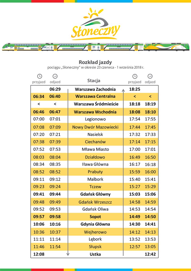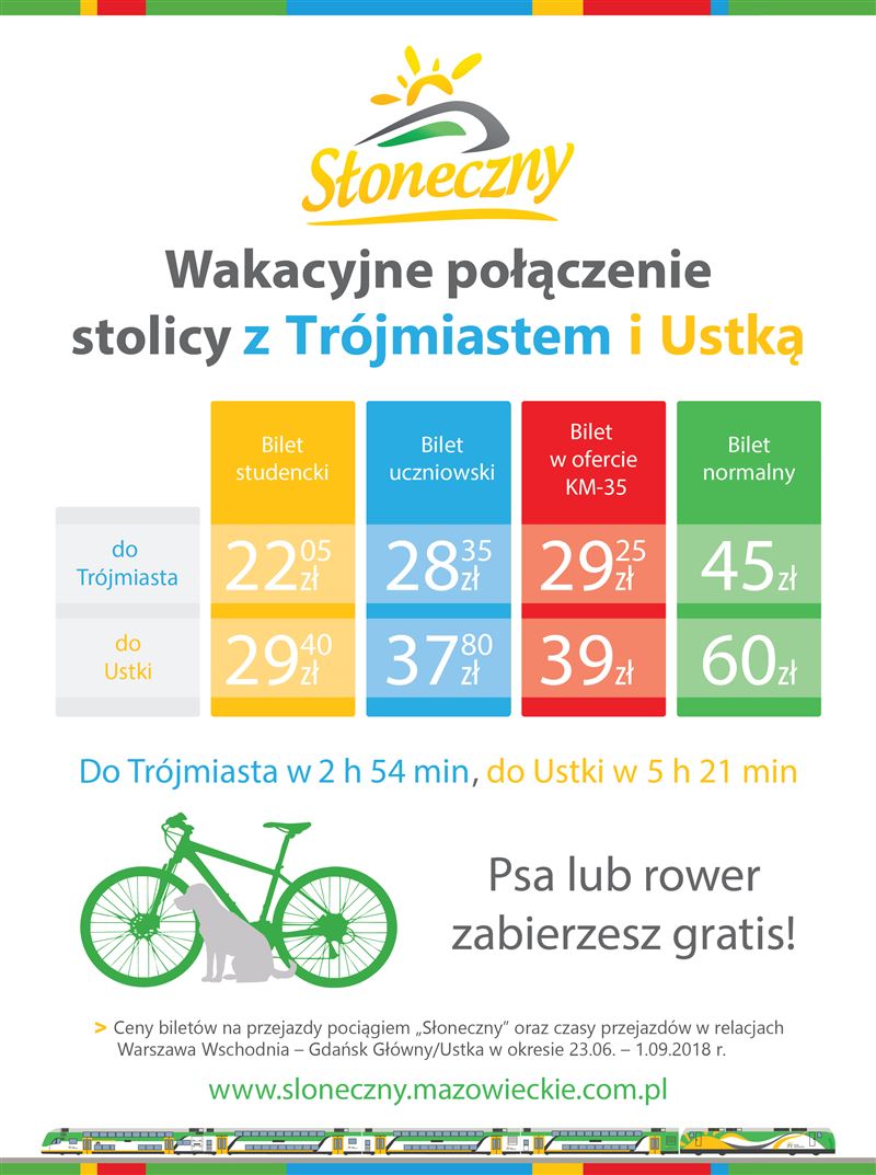 W tegoroczne wakacje już po raz czternasty na tory wyjedzie pociąg „Słoneczny” Kolei Mazowieckich. Będzie kursował codziennie w okresie 23 czerwca – 2 września w relacji Warszawa Zachodnia – Ustka – Warszawa Zachodnia. Zatrzyma się m.in. w Gdańsku, Sopocie, Gdyni, Wejherowie, Lęborku i Słupsku. Szczegółowy rozkład jazdy dostępny jest na stronie sloneczny.mazowieckie.com.pl.