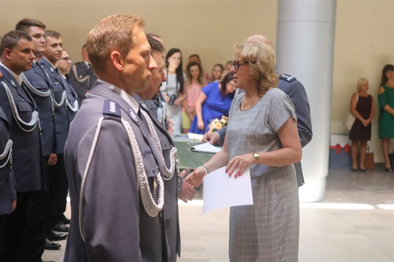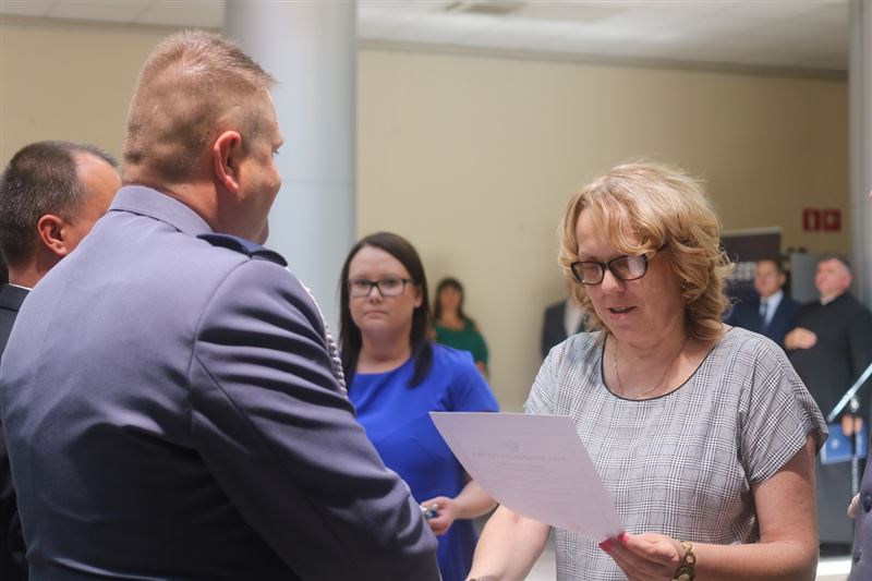 - Zgromadziliśmy się tu, przede wszystkim, by podziękować Wam za bardzo trudną i niebezpieczną pracę, ale też pracę bardzo efektywną. Każdego roku, jako powiat wspólnie z komendantem organizujemy dość szeroką w swoim zasięgu debatę o bezpieczeństwie. Statystyki, które tam są prezentowane są za każdym razem coraz lepsze, coraz wyższa jest wykrywalność przestępstw, co świadczy, jak bardzo dbacie o bezpieczeństwo mieszkańców naszego powiatu. Za to wszystko, w imieniu władz powiatowych składam serdeczne podziękowania. Zawsze będę podkreślała, że codziennie wykazujecie swój profesjonalizm i ogromne zaangażowanie, za co należy się Wam najwyższe uznanie, szacunek i wdzięczność – zwracała się starosta Jolanta Gonta do funkcjonariuszy, dodając, iż ma nadzieję, że przyszłoroczne spotkanie będzie odbywało się już w nowej siedzibie Komendy Powiatowej Policji przy ul. 1 Maja.