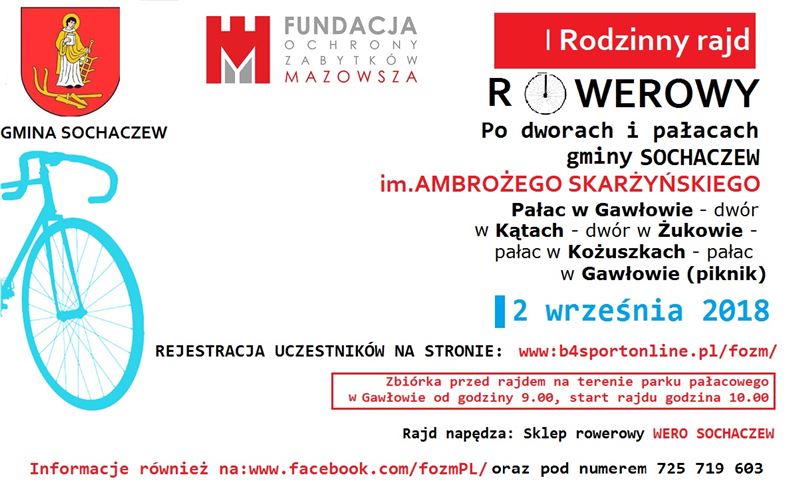Ta informacja z pewnością zainteresuje szczególnie miłośników jazdy na rowerze. Ci, którzy lubią rajdy po ziemi sochaczewskiej będą mogli ponownie uczestniczyć w kolejnym tego typu wydarzeniu. Już 2 września br. pojedziemy w I Rodzinnym Rajdzie Rowerowym „Szlakiem dworów i pałaców gminy Sochaczew im. Ambrożego Skarżyńskiego”. Jego start i meta będą miały miejsce przy pałacu w Gawłowie, a trasa wiedzie przez Kąty, Żuków i Kożuszki. Do udziału zapraszają organizatorzy - wójt gminy Sochaczew i Fundacja Ochrony Zabytków Mazowsza.
