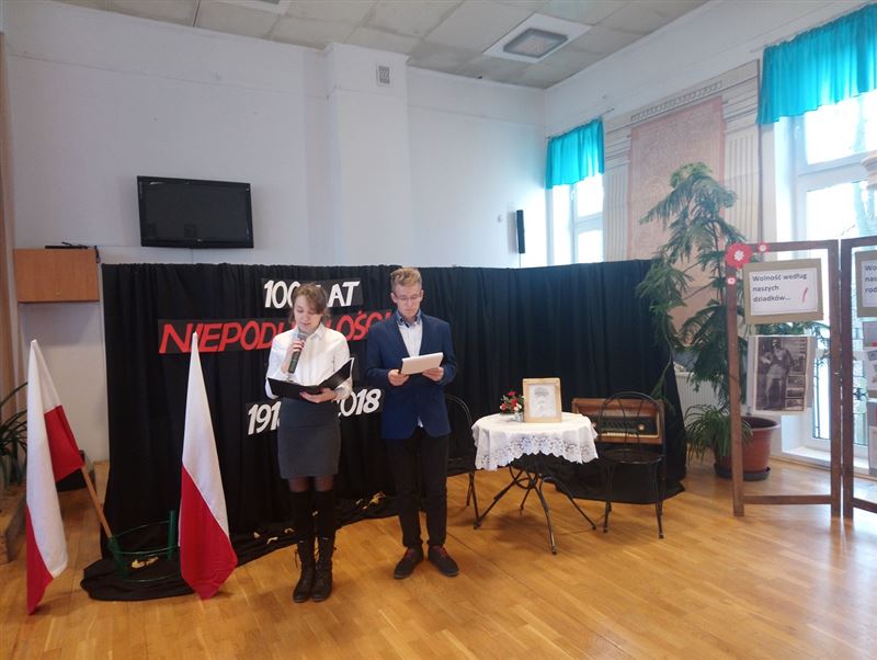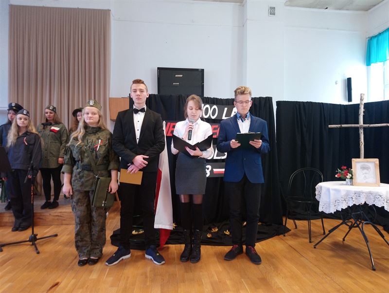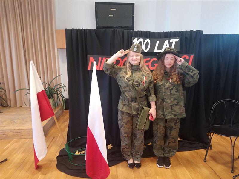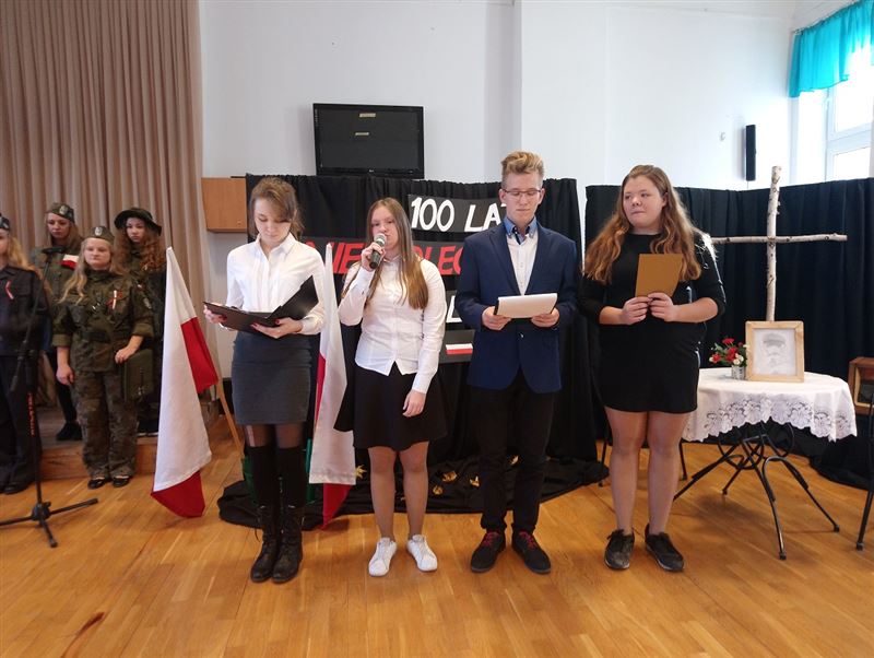 W środę 7 listopada br. rozpoczęliśmy obchody 100. Rocznicy Odzyskania przez Polskę Niepodległości w naszej szkole. Uczniowie uświetnili obchody 11 listopada pięknym programem artystycznym przygotowanym pod kierunkiem Dominiki Kubiak i Krzysztofa Habra. Pamięć minionych lat i dumę z odzyskanej niepodległości przywołały wiersze i pieśni o tematyce patriotycznej. Piękne stroje, wojskowe wyposażenie i dekoracje podkreśliły podniosły nastrój.