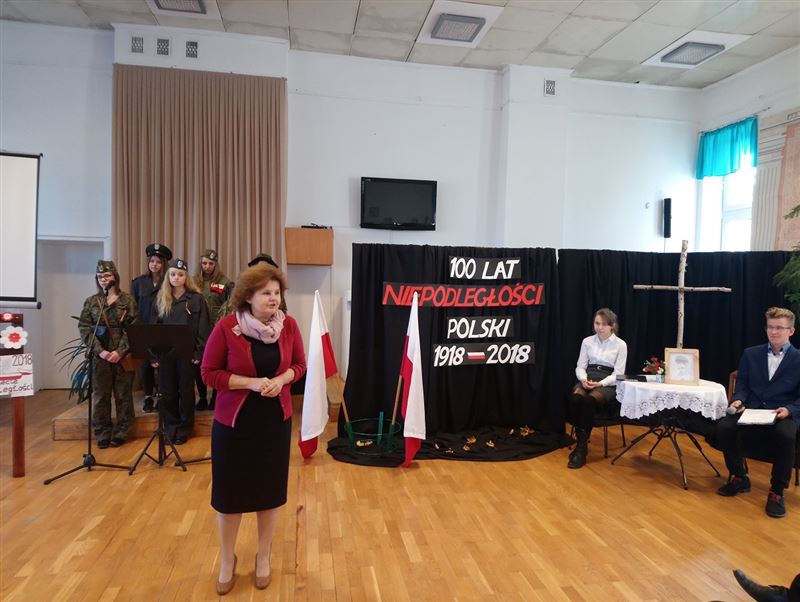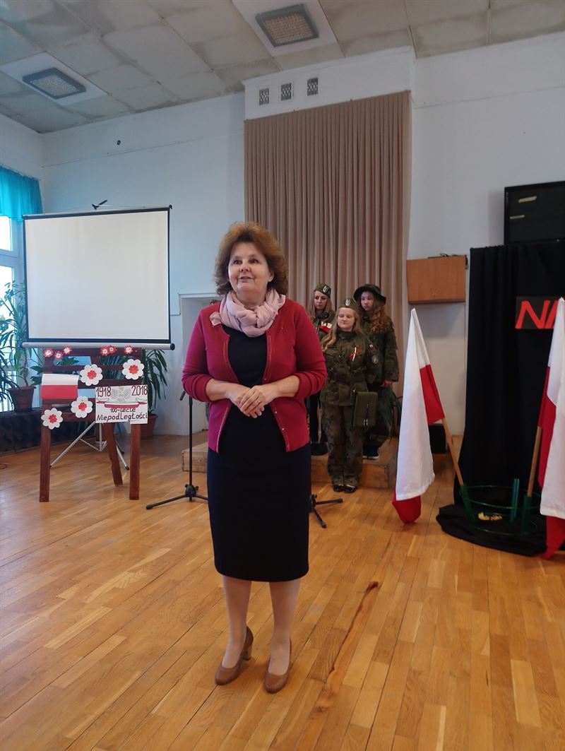 Pani dyrektor podziękowała również wszystkim uczniom, którzy, wykazali się w tym uroczystym dniu wzorową postawą patriotyczną. poprzez odpowiedni, galowy strój Podkreślili w ten sposób, że 11 listopada to symbol miłości Ojczyzny, walki o wolność kilku pokoleń Polaków, to symbol wiary i zwycięstwa po 123 latach niewoli. Musimy pamiętać, że oddając szacunek symbolom narodowym, oddajemy go wszystkim tym, którym zawdzięczamy własne państwo, którym udało się podnieść kraj z ogromnych zniszczeń I wojny światowej, stworzyć warunki rozwoju ekonomicznego, modernizacji gospodarczej i cywilizacyjnej.