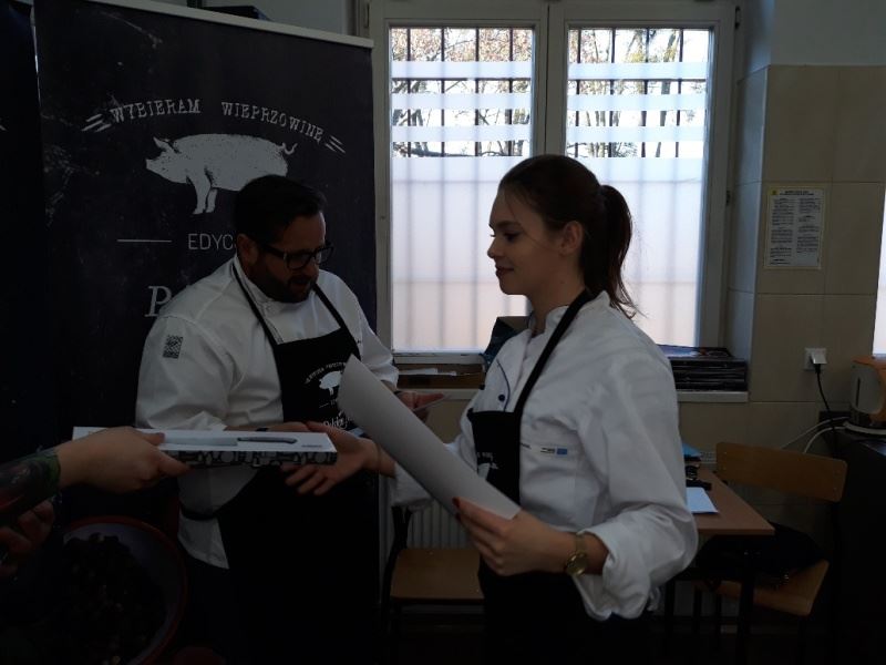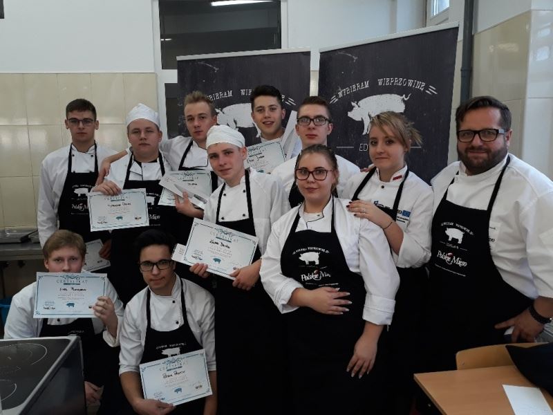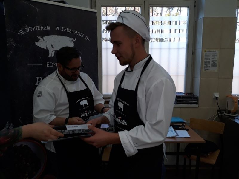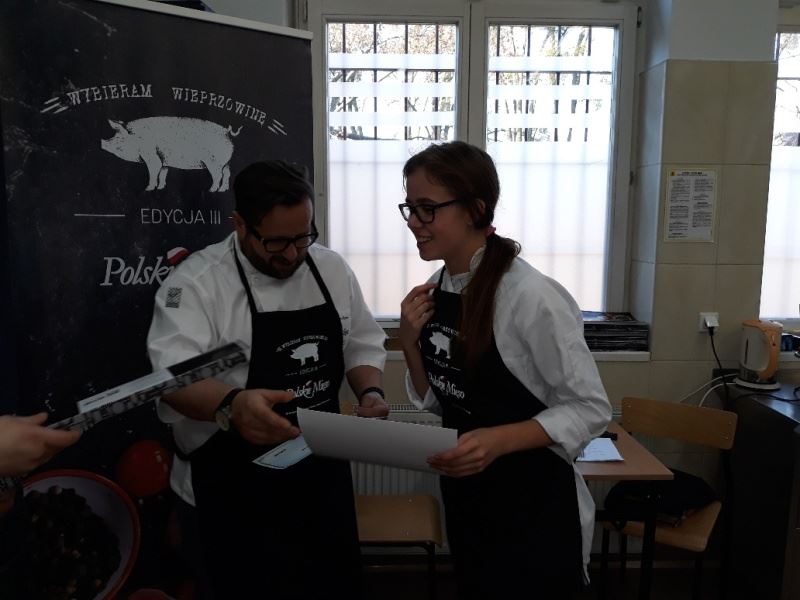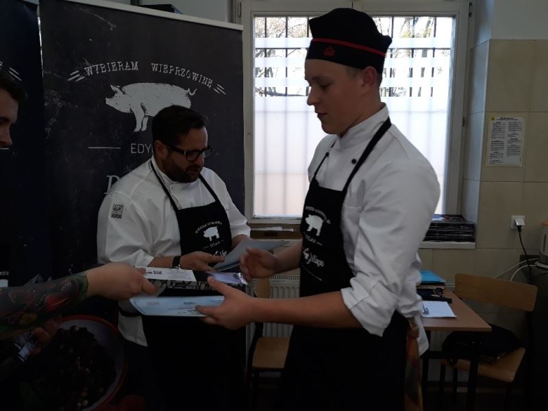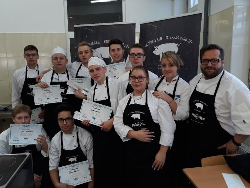 Wisienką na torcie spotkania była część praktyczna warsztatów, w której uczestniczyło 20 uczniów. Pod okiem kucharzy Akademii Kulinarnej Marcina Budynka sporządzali potrawy z wieprzowiny m. in. żeberka w sosie BBQ, schab grillowany sous-vide, kotlety wieprzowe z kością i polędwiczki. Obserwowali pracę instruktorów i pod ich czujnym okiem sporządzali dodatki do potraw i komponowali całe dania. Wszystko odbywało się pod presją czasu ale w bardzo sympatycznej atmosferze.