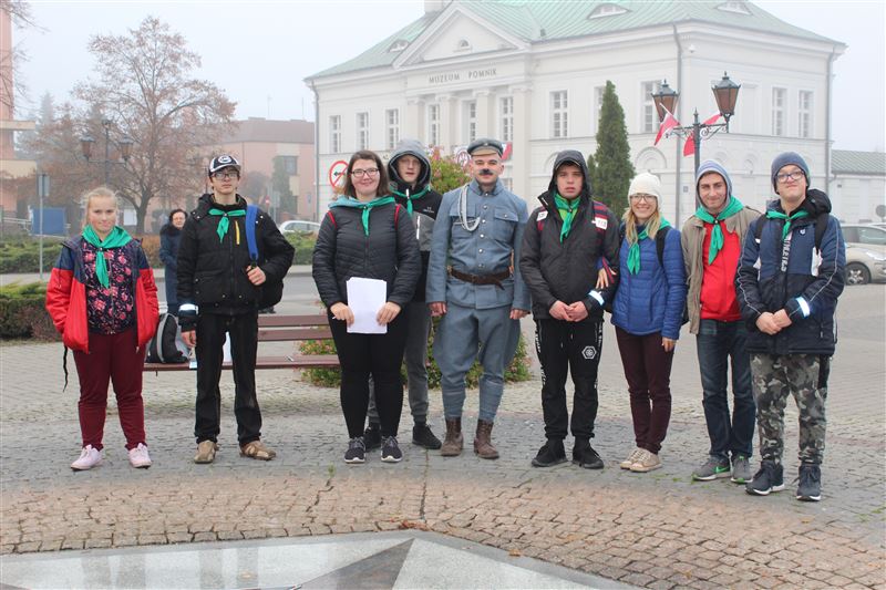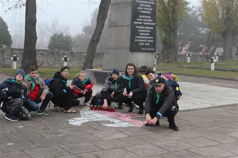 Po apelu utworzyliśmy barwny korowód, którego centralnym punktem była 20- metrowa flaga. Ruszyliśmy w kierunku pomnika prezydenta Ryszarda Kaczorowskiego, gdzie dokonano uroczystego odsłonięcia pamiątkowej tablicy upamiętniającej 100-lecie odzyskania Niepodległości i 100-lecie powstania Związku Harcerstwa Polskiego. Wielkim wyróżnieniem i zaszczytem było dla nas to, że w tym historycznym akcie uczestniczyła harcerka z naszej drużyny –Weronika Jaskółka. Po odsłonięciu tablicy i złożeniu kwiatów nastąpił dla harcerskiej braci bardzo szczególny moment - uroczyste odnowienie przyrzeczenia harcerskiego.