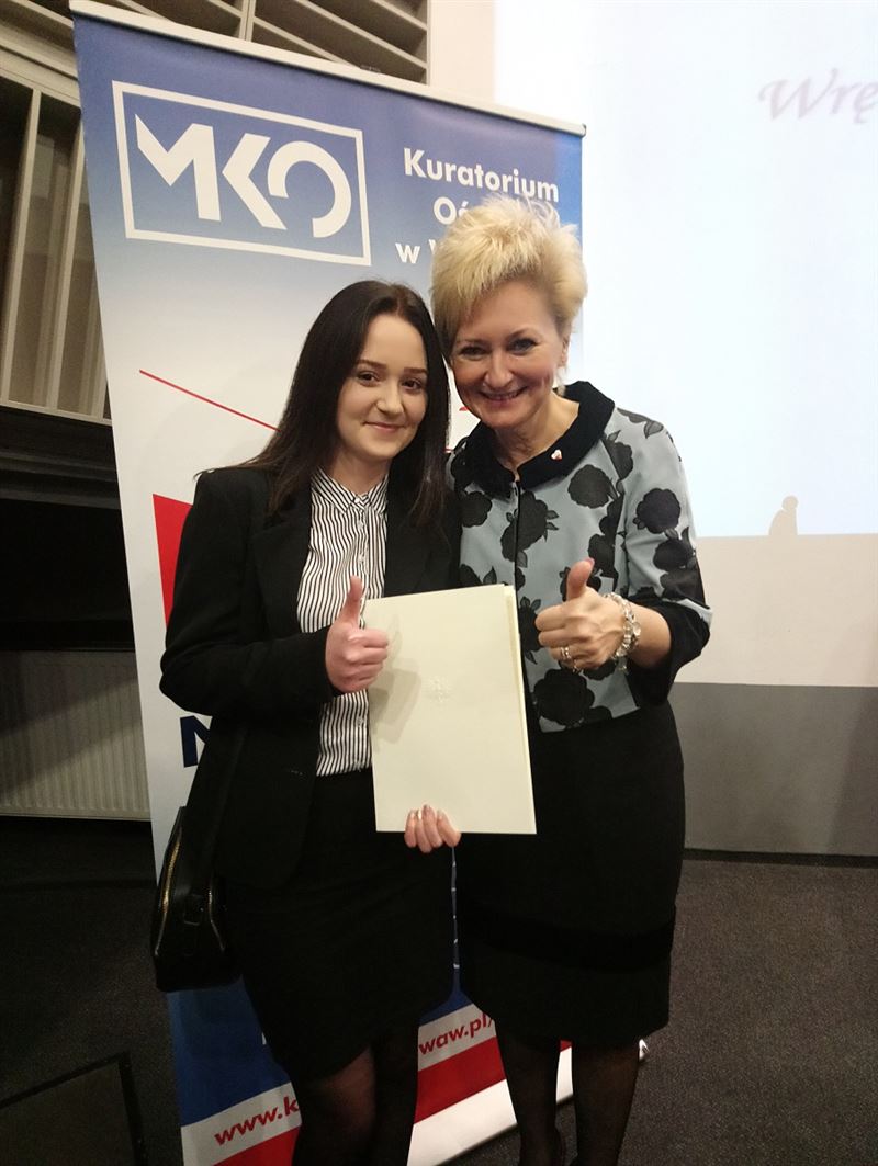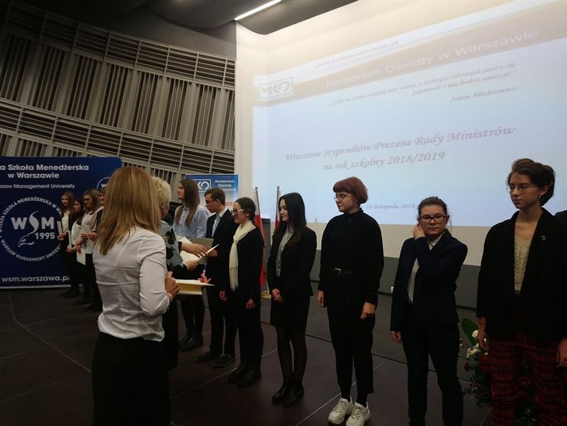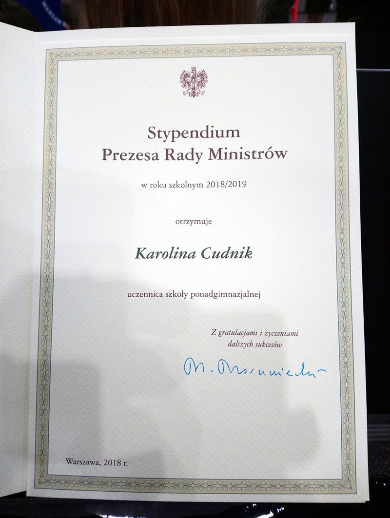 Znakomita wiadomość! Oto w poniedziałek 26 listopada br. wręczono 278 dyplomów stypendystom Prezesa Rady Ministrów rejonu warszawskiego na rok szkolny 2018/2019.W tej elitarnej grupie znalazła się uczennica klasy czwartej Technikum Logistycznego Karolina Cudnik!