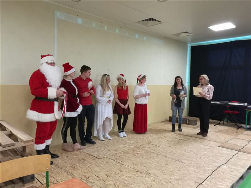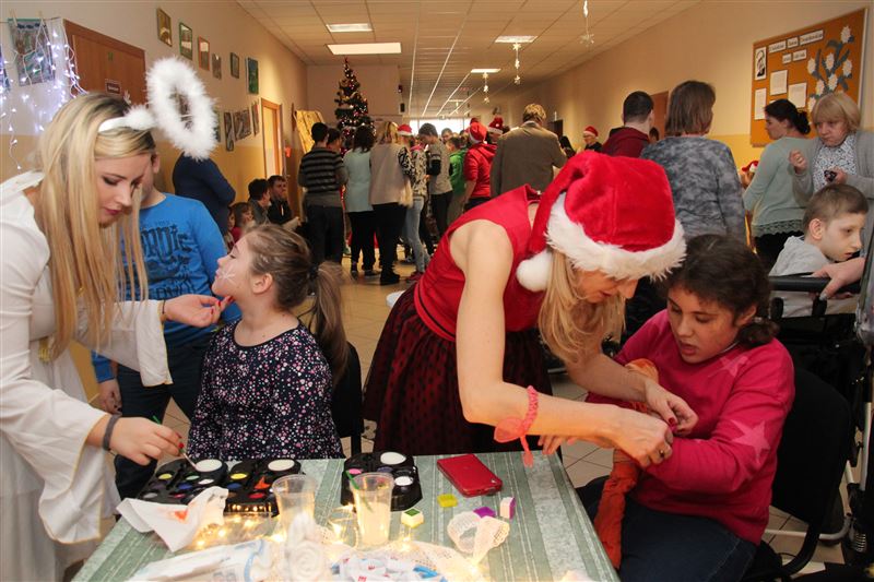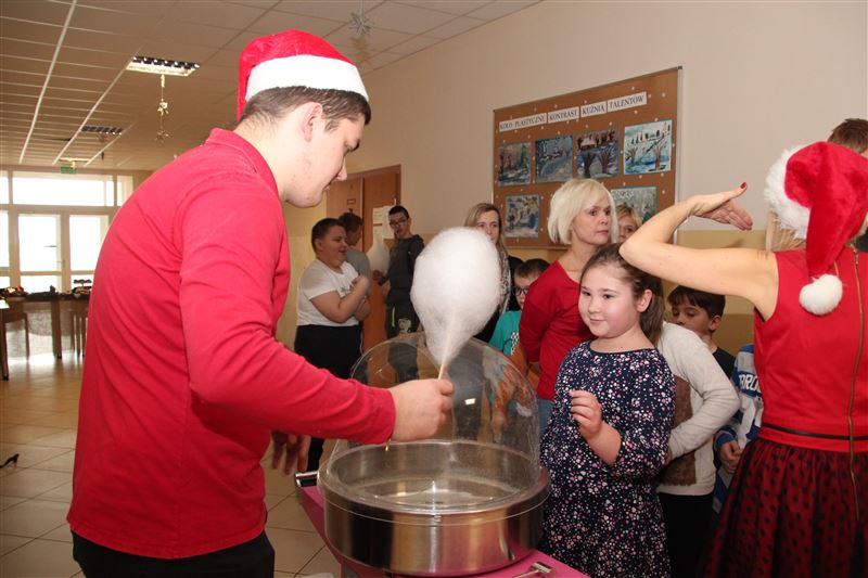 Zamiast lekcji – zabawa! To prezent mikołajkowy od Pani Dyrektor. Uczniowie mogli wziąć udział we wszystkich atrakcjach proponowanych przez Fundację, a także w konkurencjach i zabawach przygotowanych przez naszych nauczycieli. Od rana wszystkie klasy wykonywały zbiorowe prace plastyczne: wielkoformatowe bożonarodzeniowe kolorowanki. Później korytarze szkolne wypełniły się świąteczną muzyką, rozbrzmiewającą przez szkolny radiowęzeł oraz zaroiły się od amatorów wszelakich rozrywek. Można było wziąć udział w konkurencjach i zabawach sportowych takich jak: gra w ping-ponga, tor przeszkód z jajkiem na łyżce, rzuty do celu, czy też kręgle. Nie zabrakło też rozrywki umysłowej, dzięki panu Wiesławowi Jachowi, mistrzowi szachowemu, który rozgrywał z naszymi uczniami symultaniczne partie warcabów.