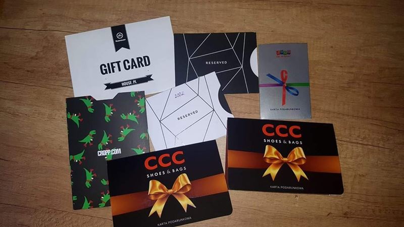 karty podarunkowe do sklepów z odzieżą i obuwiem o łącznej wartości 1200 zł.