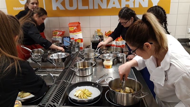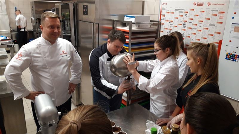 Młodzież z „Ogrodnika” po raz kolejny wzięła udział w szkoleniu w Instytucie Kulinarnym Transgourmet w Ożarowie Mazowieckim. Tym razem tematem przewodnim były „Desery w kuchni miedzynarodowej”. Uczniowie pod okiem profesjonalnego kucharza Karola Lisińskiego tworzyli prawdziwe cuda. Każdy mógł nauczyć się wykonywać rozmaite słodkości. Przygotowali miedzy innymi: Sernik z białej czekolady, Szarlotkę w tortilli z sosem waniliowym, Tiramisu, Naleśniki Suzette, Fondat czekoladowy oraz Tarta Tatin z jabłkami i lodami waniliowym. Uczniowie byli zachwyceni warsztatami, mieli możliwość posługiwania się profesjonalnym sprzętem, a także poznali specjalne surowce przeznaczone do cukiernictwa. Prowadzący docenił zaangażowanie i kreatywność naszych uczniów. Wiedzę, którą zdobyli śmiało mogą wykorzystać w przyszłości.
