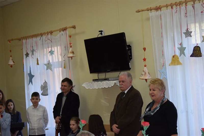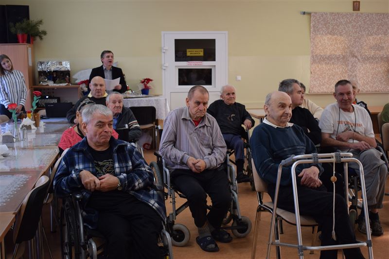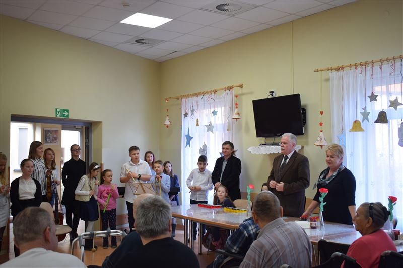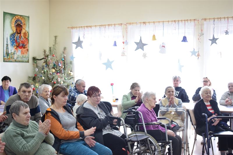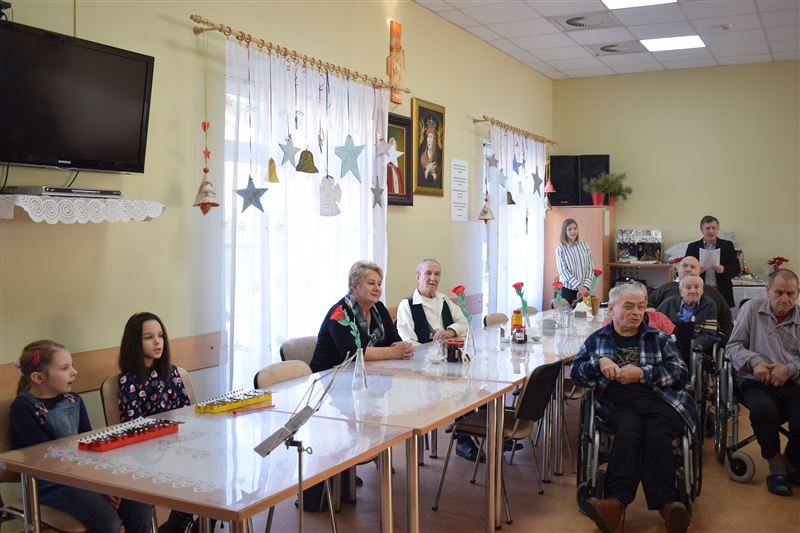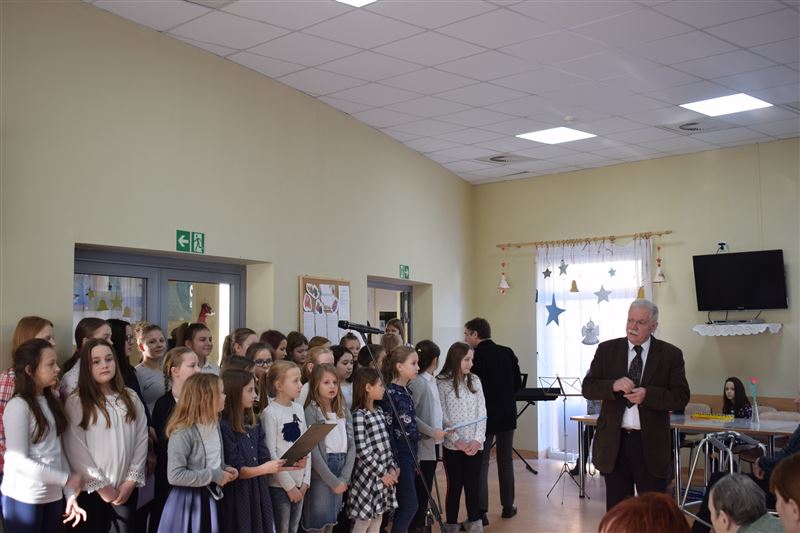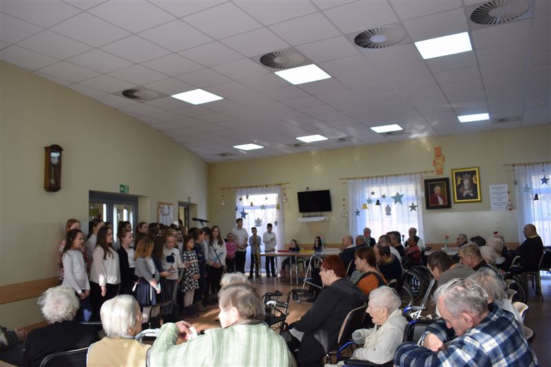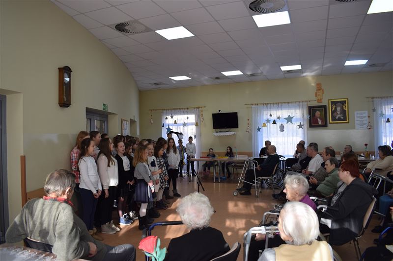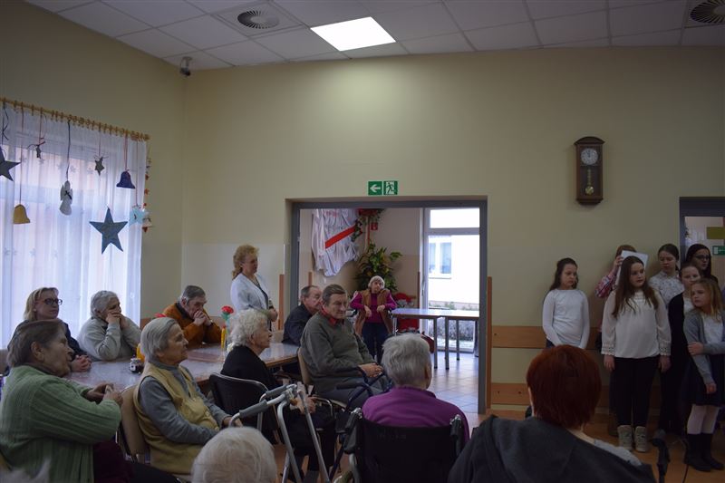 Dom Pomocy Społecznej w Młodzieszynie w środę 23 stycznia br. odwiedziła grupa dzieci ze Szkoły Podstawowej w Gawłowie. Wraz z dyrektor Ewą Grzelak i Adamem Wojciechowskim – nauczycielem muzyki. Grupa artystów zaprezentowała swoje umiejętności muzyczno-wokalne. Mogliśmy usłyszeć różnorodne utwory muzyczne. Miłym akcentem była pamięć o naszych Dziadkach i Babciach którzy niedawno obchodzili swój dzień. Uczniowie sprawili wiele radości naszym mieszkańcom dedykując piosenki nawiązujące do ich święta. Na koniec przedstawienia mogliśmy razem z artystami zaśpiewać piękne kolędy. Było nam bardzo miło gościć tak wspaniałą młodzież, która z dużym zaangażowaniem uczestniczyła w spotkaniu. Z wielką przyjemnością dziękujemy za przybycie i serdecznie zapraszamy na kolejne występy.