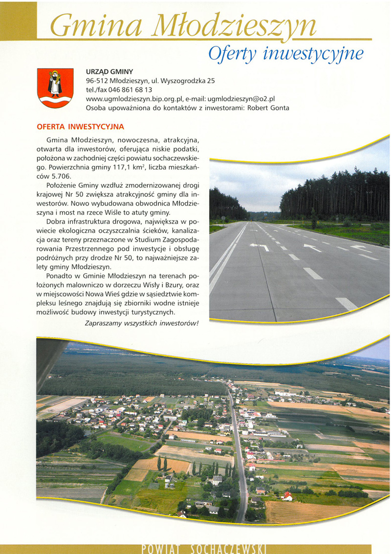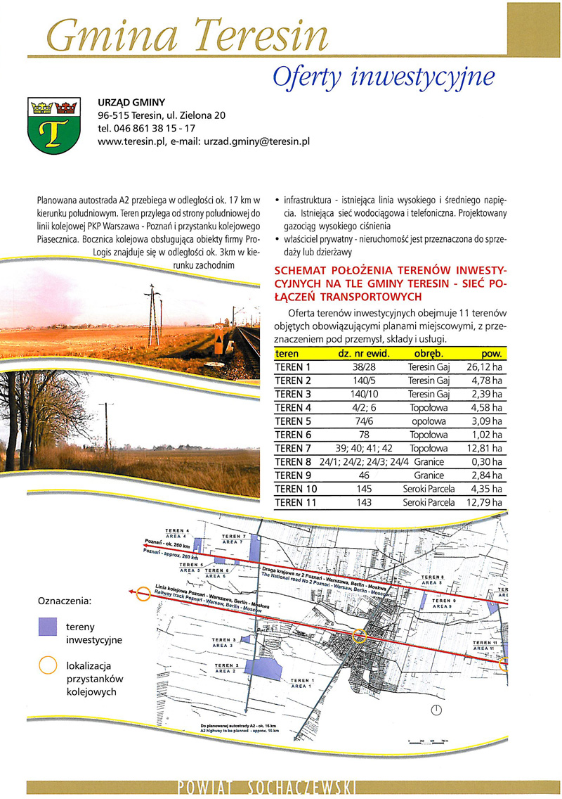 Samorządy są właścicielem ciekawych inwestycyjnie obszarów możliwych do zagospodarowania w powiecie sochaczewskim. Punktem wyjścia do ich aktywizacji i promowania powinna być ich szczegółowa inwentaryzacja, z rozpoznaniem możliwości lokowania działalności gospodarczej oraz dostępności i stanu technicznego infrastruktury, jeśli takowy jest – temu właśnie ma służyć nowy folder.