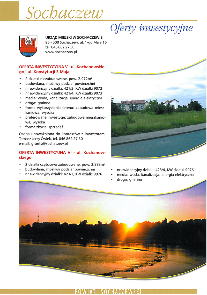 Obok oferty inwestycyjnej większości gmin powiatu oraz miasta zaprezentowano atrakcje turystyczne naszego regionu. Folder wydany został w formacie A4, w pełnym kolorze. Informacje ubarwiają zdjęcia ukazujące atrakcyjność powiatu sochaczewskiego. W katalogu ofert inwestycyjnych powiatu znalazło się też miejsce dla reklamodawców.