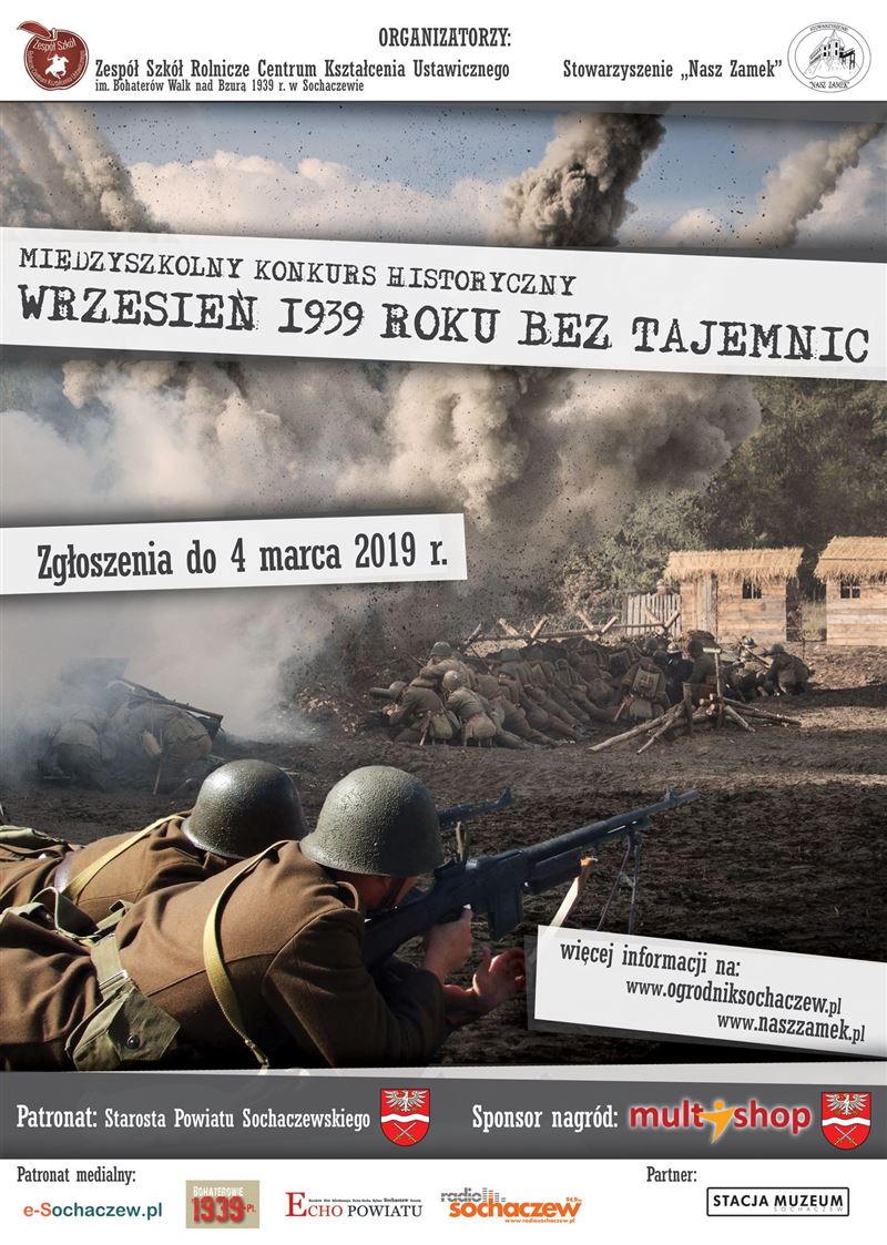 Zespół Szkół Rolnicze Centrum Kształcenia Ustawicznego w Sochaczewie oraz Stowarzyszenie „Nasz Zamek” już po raz trzeci organizują Międzyszkolny Konkurs Historyczny „Wrzesień 1939 roku bez tajemnic”. Jego głównym celem jest zainteresowanie uczniów najnowszą historią Polski, walkami w kampanii wrześniowej 1939 roku ze szczególnym uwzględnieniem bitwy nad Bzurą. Konkurs jest skierowany do uczniów klas siódmych, ósmych szkół podstawowych i gimnazjów położonych na terenie Sochaczewa, powiatu sochaczewskiego oraz w gminach sąsiadujących z naszym powiatem. Patronat nad konkursem objął Starosta Powiatu Sochaczewskiego, a partnerem zostało Muzeum Kolei Wąskotorowej w Sochaczewie. Laureaci z trzech pierwszych miejsc, otrzymają atrakcyjne nagrody rzeczowe. Ich sponsorami są firma Retail Park Sochaczew sp. z o.o., właściciel obiektu Multishop Sochaczew oraz Starostwo Powiatowe w Sochaczewie (Powiatowy Zespół Edukacji w Sochaczewie).