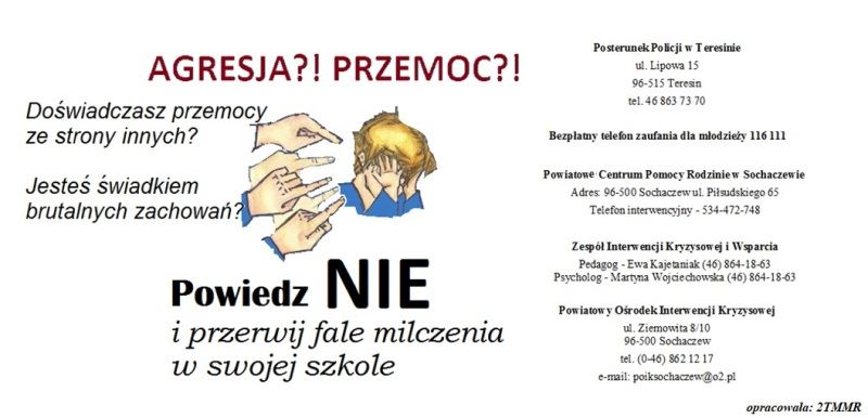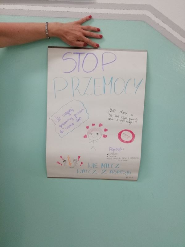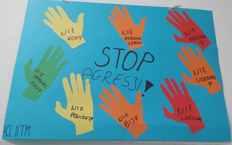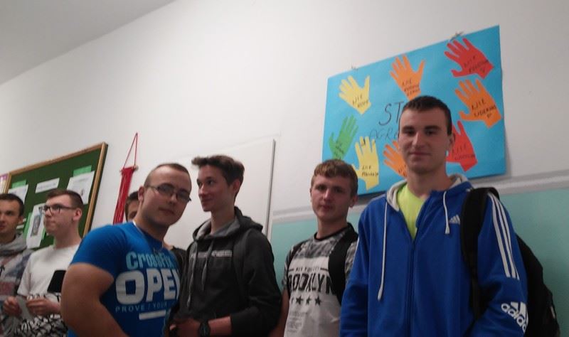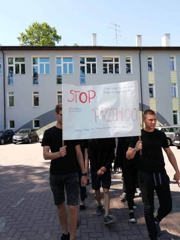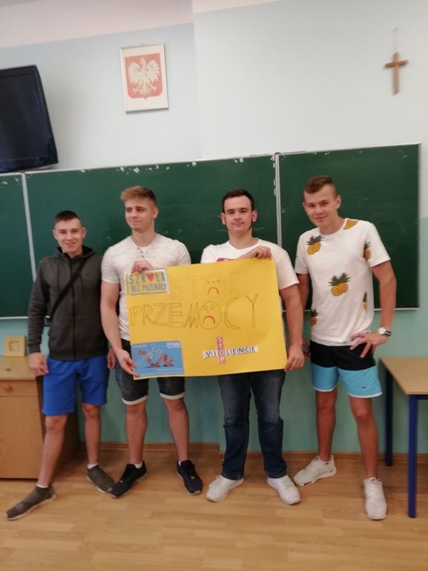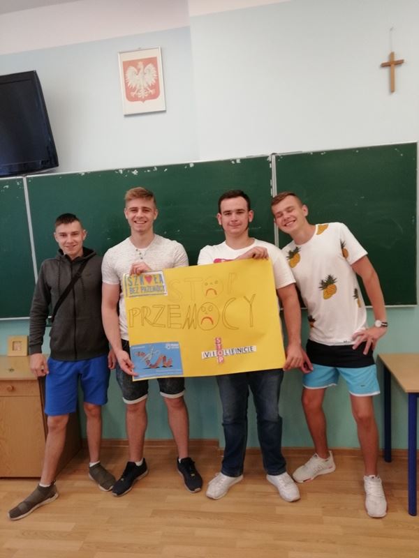 Uczniowie klasy II TMMR, wraz z wychowawcą Sylwią Krzeszowiec wykonali plakat i ulotki profilaktyczne pod hasłem: „Stop Agresji, Nie! dla przemocy w szkole. Przemoc zaczyna się od najsłabszych". W klasie na godzinie wychowawczej opracowano psychologiczny profil ofiary przemocy. Uczniowie I TMMR wraz z wychowawcą klasy Edytą Gałecką wykonali plakat o cyberprzemocy, na godzinie wychowawczej chłopcy zaimprowizowali scenki o tematyce przemocy. W klasie I TL na godzinie wychowawczej przeprowadzono pogadankę, uczniowie odegrali scenki prezentujące różne formy agresji i przemocy. Uczennice klasy II TKL, wykonały plakat profilaktyczny. Na potrzeby akcji na korytarzach szkolnych zawieszono plakaty profilaktyczne o tematyce: