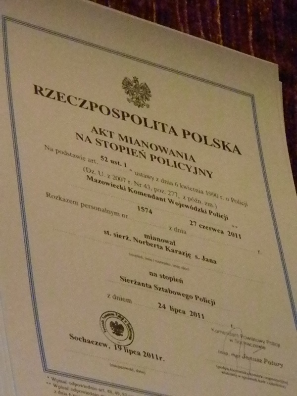 Z okazji 92. rocznicy powołania Policji Państwowej 21 lipca w Miejskim Ośrodku Kultury w Chodakowie odbyło się oficjalne nominowanie zasłużonych policjantów. Podczas obchodów tego święta z rąk Przewodniczącej Rady Powiatu Haliny Pędziejewskiej, jak również w imieniu starosty sochaczewskiego Tadeusza Korysia przekazała ona życzenia wraz z podziękowaniami za sumienną i rzetelną pracę oraz przykładne wypełnianie obowiązków służbowych przez policjantów i pracowników cywilnych Komendy Powiatowej Policji w Sochaczewie. - Policja to umundurowana i uzbrojona formacja służąca społeczeństwu i przeznaczona do ochrony bezpieczeństwa ludzi oraz do utrzymywania bezpieczeństwa i porządku publicznego. Wasz intensywny wysiłek nakierowany na stałe doskonalenie poziomu pracy Policji owocuje w Naszym powiecie zauważalnymi efektami – podkreślała w swoim przemówieniu przewodnicząca Rady Powiatu H. Pędziejewska.