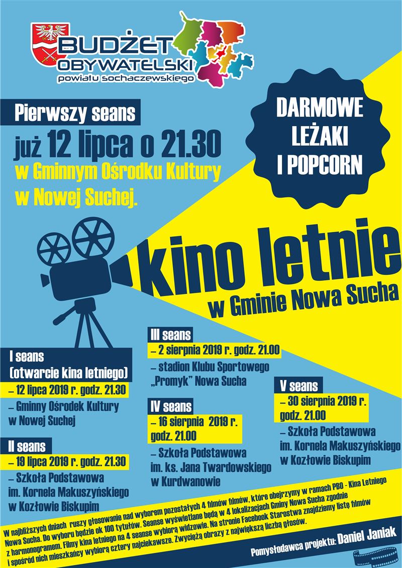 Zorganizowaniem kina letniego w Nowej Suchej w ramach Powiatowego Budżetu Obywatelskiego zajmie się firma Recon z Płocka. Pokazy filmowe odbywać się będą w 4 placówkach zarządzanych przez Gminę Nowa Sucha w terminach 12 i 19 lipca (o 21.30) oraz 2, 16 i 30 sierpnia (o 21.00). Do dyspozycji widzów będzie 100 leżaków. Organizator zapewni również tyle samo porcji darmowego popcornu.
