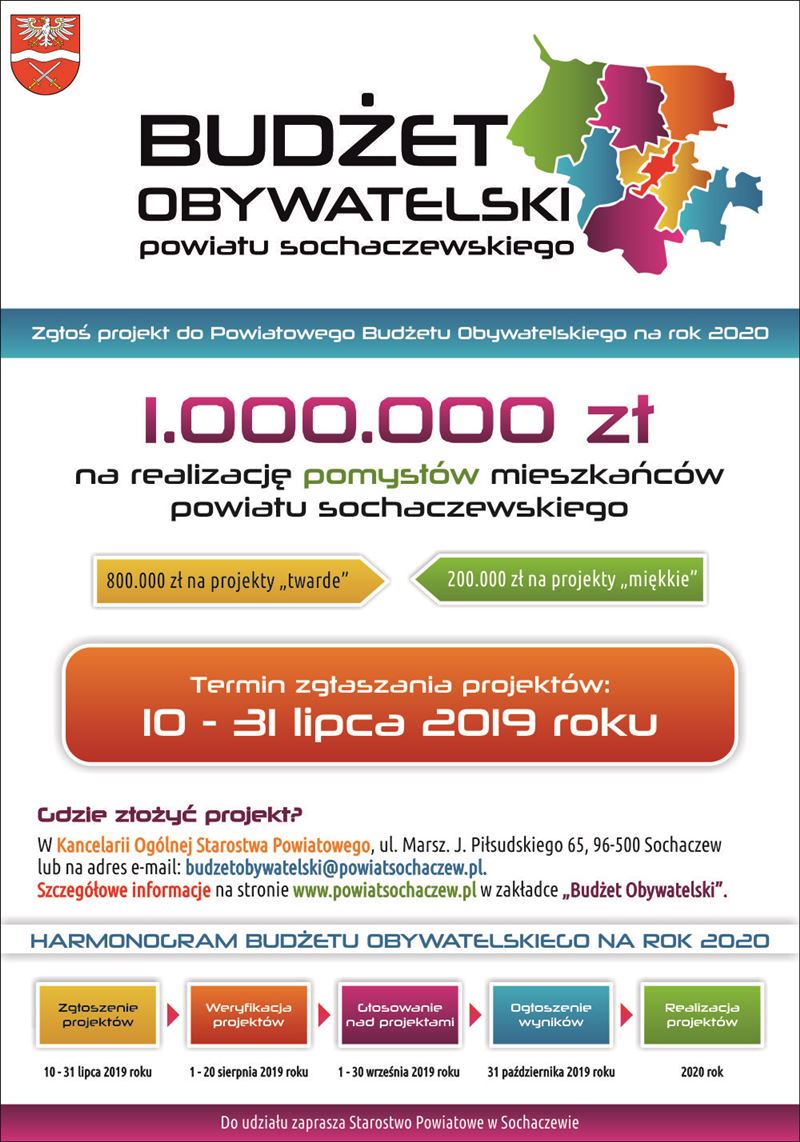 Budżet obywatelski, zwany również partycypacyjnym, jest demokratycznym mechanizmem, w ramach którego mieszkańcy współdecydują o wydatkach publicznych danego samorządu w perspektywie kolejnego roku budżetowego. 1 mln zł czeka na sfinansowanie realizacji pomysłów mieszkańców naszego powiatu. Szczegóły na plakacie!