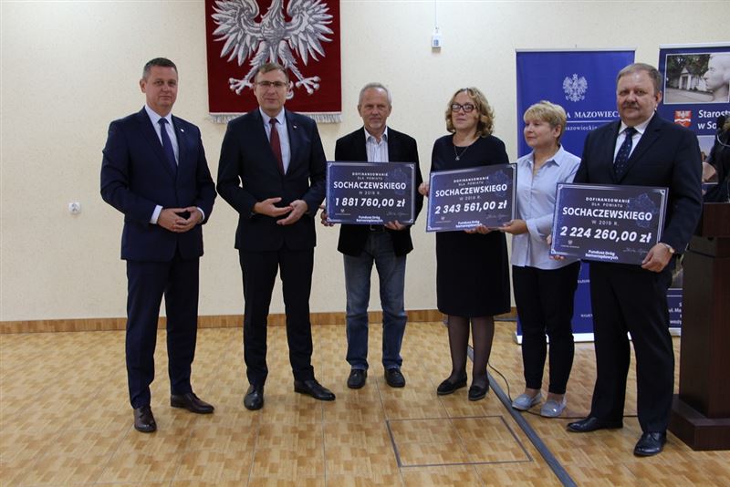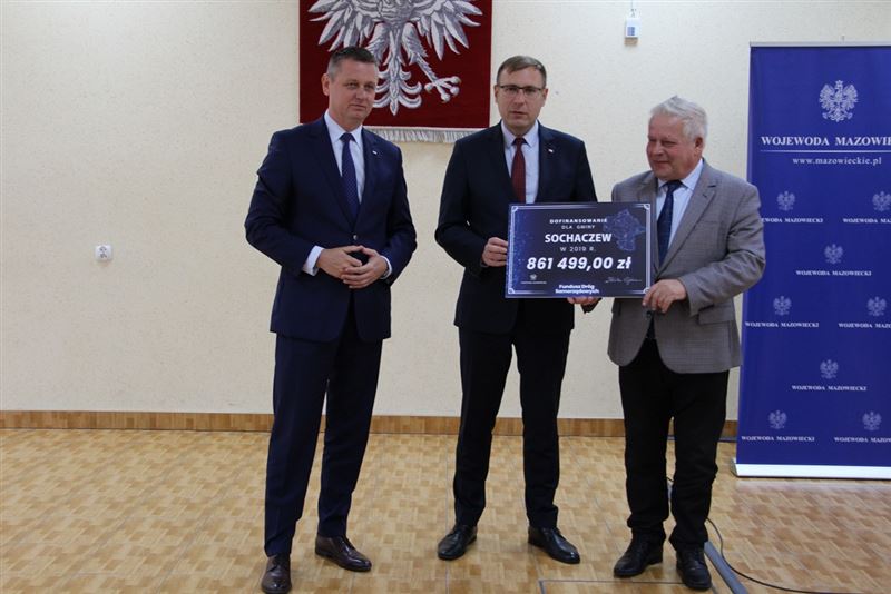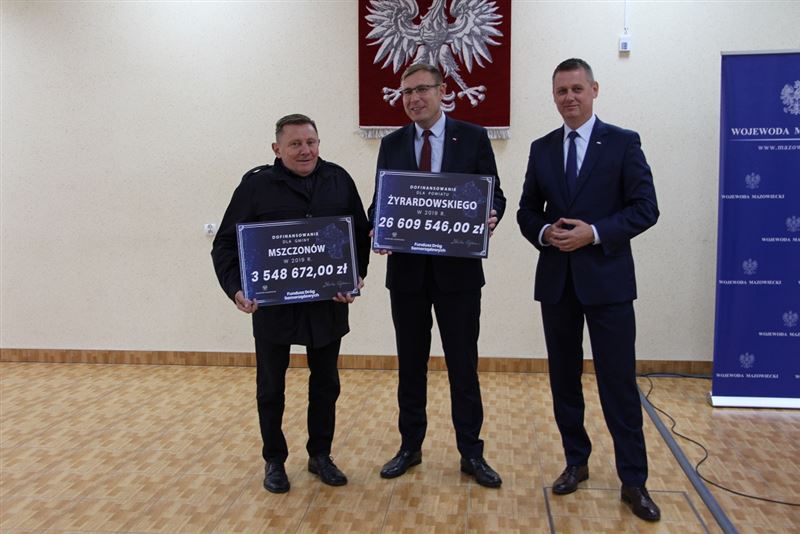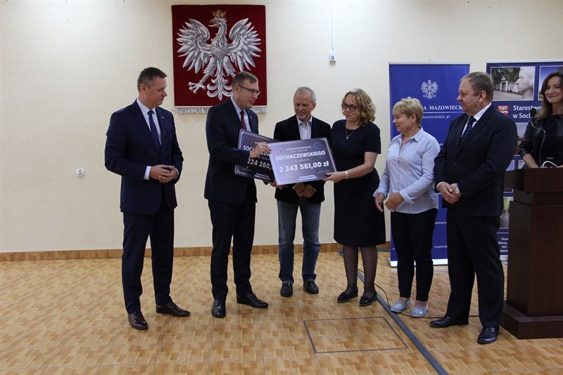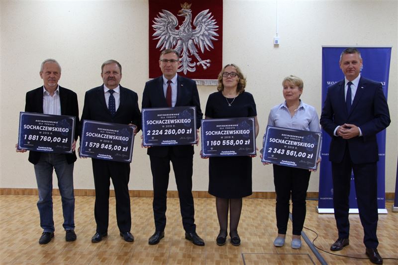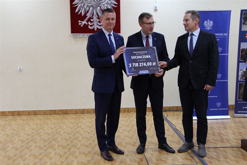 Samorządowcom z powiatu sochaczewskiego i żyrardowskiego, 24 września br. w sali konferencyjnej Starostwa Powiatowego w Sochaczewie zostały wręczone symboliczne czeki potwierdzające otrzymanie dotacji z nowego programu rządowego - Funduszu Dróg Samorządowych. Wręczenia czeków dokonał wicewojewoda mazowiecki Artur Standowicz oraz poseł Maciej Małecki. Największą pulę, bo aż na pięć dróg odebrał powiat sochaczewski na łączną kwotę ponad 9 mln zł.