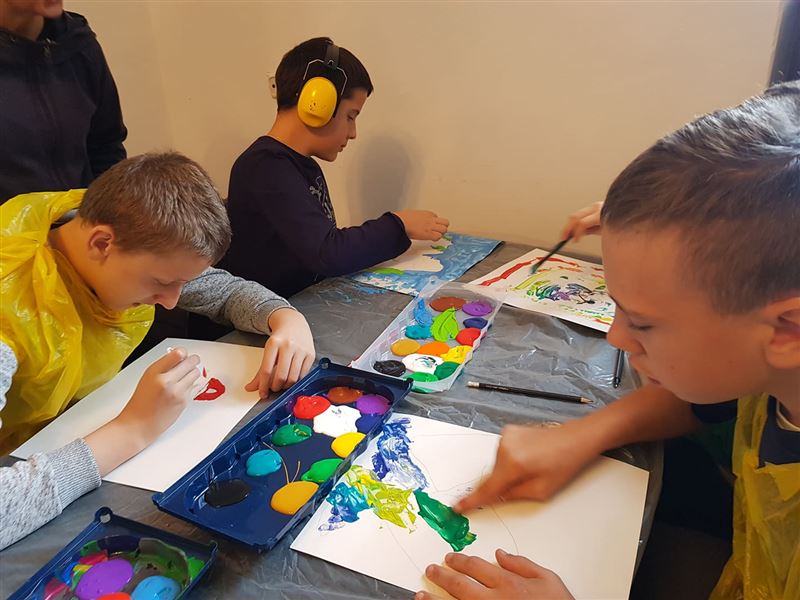 W tajniki malarskiego świata wprowadziła nas, zaprzyjaźniona ze szkołą od lat, sochaczewska artystka Pani Beata Szustkiewicz. Poznaliśmy sposób malowania szpachlą z wykorzystaniem grubej warstwy farby oraz plastikowych nożyków i szpachelek. Uczniowie stworzyli niezwykłe, wielobarwne obrazy, które będzie można podziwiać na wystawie wieńczącej cały cykl warsztatów artystycznych. Po zajęciach czekał na nas pyszny poczęstunek.