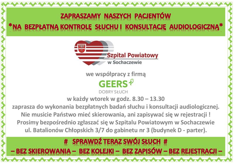 Informacja Szpitala Powiatowego w Sochaczewie 29-10-2019 14:28 A A A Zachęcamy do udziału w badaniach, m.in. badania kontroli słuchu. ZOBACZ GALERIE