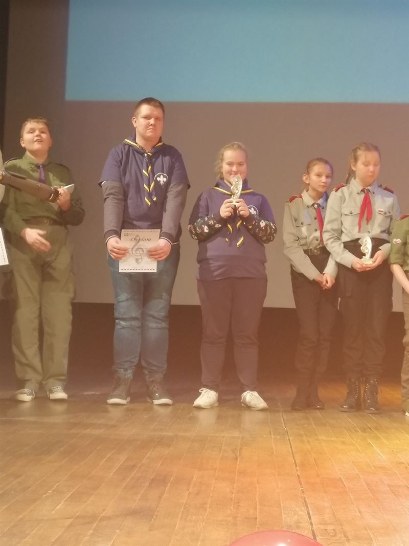 Nasi uczniowie przedstawili pieśń ,,Pierwsza Kadrowa” i pląs ,,Radi, radi”. W gronie występujących z naszej szkoły było wielu początkujących harcerzy, którzy z dużym zaangażowaniem i radością podeszli do zadania. Występ naszej drużyny spodobał się publiczności i został nagrodzony oklaskami oraz głośnym, harcerskim okrzykiem. W przeglądzie wzięło udział 15 drużyn: 2 gromady zuchowe i 13 drużyn harcerskich.