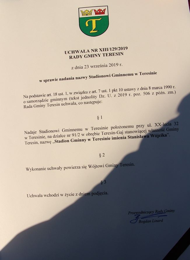 Od 11 grudnia br. teresiński stadion GOSiR oficjalnie nosi imię Stanisława Wójcika, Honorowego Obywatela Gminy Teresin, ale też byłego dyrektora i założyciela Zespołu Szkół w Teresinie. Był wielkim entuzjastą sportu, niezwykle szanowanym przez nie tylko lokalną społeczność, o czym w swym przemówieniu mówił wójt gminy Marek Olechowski. Odsłonięcia pamiątkowej tablicy dokonała żona śp. Stanisława Wójcika – Irena wraz z najbliższą rodziną. W uroczystości udział wzięli uczniowie, nauczyciele i dyrekcja Zespołu Szkół, samorządowcy gminni i powiatowi, dyrektorzy jednostek samorządowych gminy, działacze sportowi i mieszkańcy powiatu, wśród nich m.in. Zbigniew Komorowski, Honorowy Obywatel Gminy Teresin.