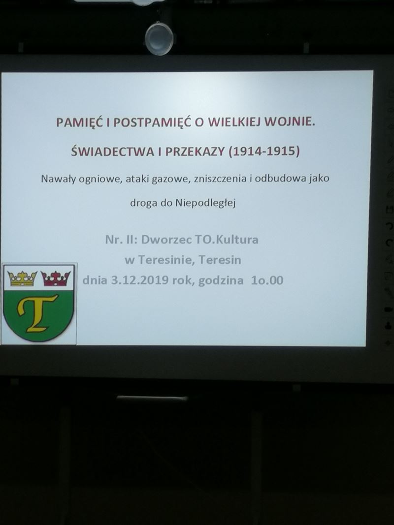 To była niezwykła lekcja historii. Uczniowie klas pierwszych Zespołu Szkół w Teresinie z nauczycielkami Katarzyną Wróbel i s. Urszulą Rostankowską, na zaproszenie dyrektor Gminnej Biblioteki Publicznej w Teresinie Aleksandry Starus gościli na Dworcu TO.Kultura! i wysłuchali prelekcji pt. „Pamięć i postpamięć o wielkiej wojnie. Świadectwa i przekazy (1914-1915). Ataki gazowe, nawały ogniowe, zniszczenia i odbudowa jako droga do Niepodległej”, którą wygłosiła dr hab. Anna Zalewska, historyk i archeolog z Uniwersytetu Marii Curie-Skłodowskiej w Lublinie i Instytutu Archeologii i Etnologii PAN. – Zdawałoby się, że o dwóch największych konfliktach zbrojnych XX wieku wiemy już wszystko. Tymczasem nadal mgłą tajemnicy owiane są walki na froncie wschodnim podczas I wojny światowej – mówili uczestnicy spotkania. Badaczka chce przywrócić wiedzę i pamięć o odcinku frontu wschodniego w rejonie Rawki i Bzury, który przebiegał w tym miejscu od grudnia 1914 do lipca 1915 roku - „Pod koniec 1914 roku rejon Rawki i Bzury stał się ostatnim rosyjskim bastionem zagradzającym Niemcom drogę do zdobycia Warszawy. Toczyła się tu krwawa, wyniszczająca wojna pozycyjna, w efekcie której poległo dziesiątki tysięcy żołnierzy, całkowicie zrównano z ziemią wiele wsi i wyhamowano rozwój kilku miasteczek i miast”. Zebrani obejrzeli także film „Pogrzebane wspomnienia” („Burried Memories” w reż. Erica Vander Borght), prezentację multimedialną oraz wystawę. – Wykład bardzo podobał się uczniom, a Anna Zalewska, chętnie odpowiadała na pytania pasjonatów historii. Nagrodę książkową dla najaktywniejszego uczestnika warsztatów historycznych otrzymał Jakub Kulak – informuje Katarzyna Wróbel. W spotkaniu uczestniczyli też m.in. zastępca wójta gminy Teresin Marek Jaworski ze Stowarzyszenia „Teresin Nasze Korzenie” oraz dyrektor Gminnego Ośrodka Kultury w Nowej Suchej Ireneusz Łukawski.
