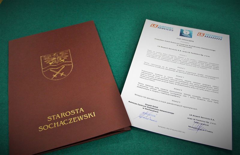 Pełnomocnik Zarządu LS Airoport Services SA do spraw LS Academy, Adam Jaszczuk i dyrektor Zespołu Szkół RCKU Marek Wernicki podpisali list intencyjny w sprawie współpracy w celu realizacji działań zmierzających do podniesienia jakości i efektywności kształcenia zawodowego zgodnie z potrzebami oraz kierunkami rozwoju LS Airport Services oraz LS Technics i Technikum w zawodzie technik eksploatacji portów i terminali. Miało to miejsce w piątek, 10 stycznia br. w sali konferencyjnej Zespołu Szkół RCKU. Podpisanie listu odbyło się w obecności wicestarosty sochaczewskiego - Tadeusza Głuchowskiego, dyrektora Powiatowego Zespołu Edukacji - Urszuli Opasiak, a także Macieja Mechackiego, koordynatora projektu LS Academy i Remigiusza Szafrańskiego - przedstawiciela zespołu nauczycieli kształcenia zawodowego, który współpracę zainicjował. Ponadto, uczestnikami i świadkami wydarzenia byli wszyscy uczniowie technikum eksploatacji portów i terminali wraz z wychowawcami.
