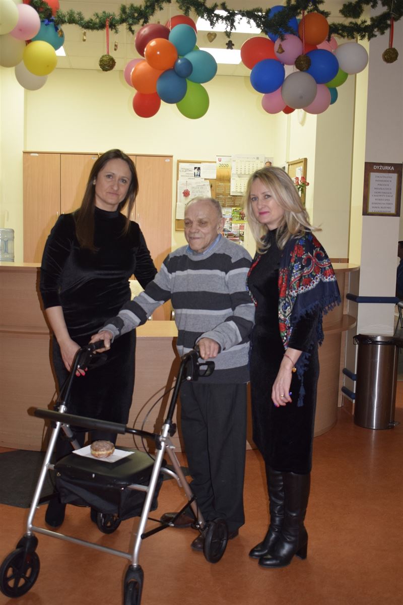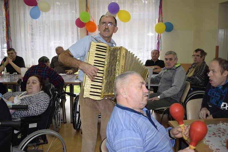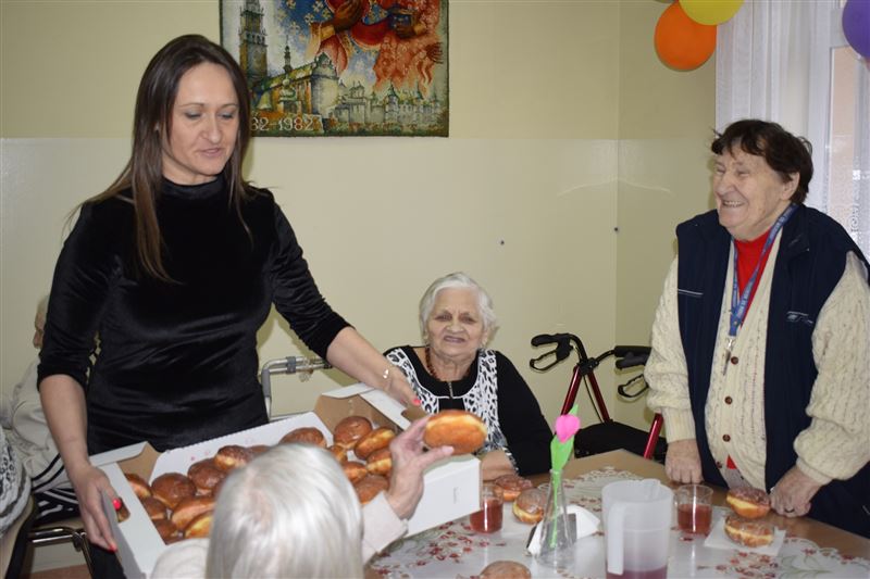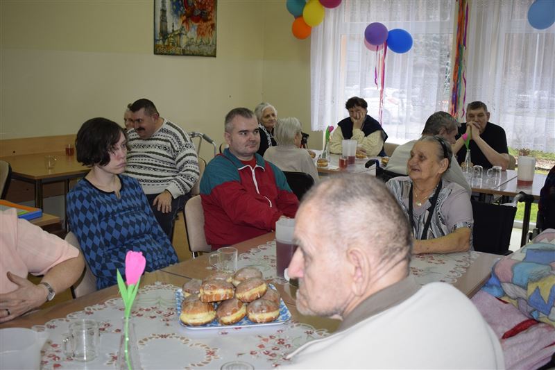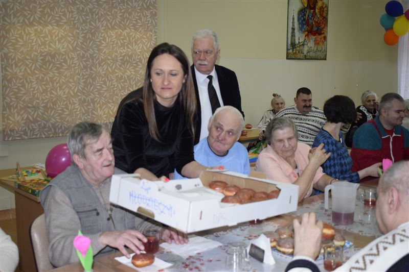 To był szczególny dzień dla każdego łasucha, ale w szczególności dla mieszkańców Domu Pomocy Społecznej w Młodzieszynie. To dzień, w którym Wójt Gminy Młodzieszyn Pani Monika Pietrzyk i Sekretarz Gminy Pani Anna Sobieraj z okazji obchodów Tłustego Czwartku odwiedziły naszych podopiecznych. Jak wiadomo tradycyjnie w tym dniu częstujemy się pączkami i z taką też niespodzianką zawitały do Nas panie z urzędu gminy. Wszyscy wspólnie ze smakiem zajadali się pysznościami w tym także przepysznym tortem, gdyż nasz mieszkaniec tego dnia obchodził swoje 40 urodziny. Spotkanie upływało radośnie przy akordeonowych dźwiękach. Ale to jeszcze nie koniec zabaw w naszym Domu przed Wielkim Postem.