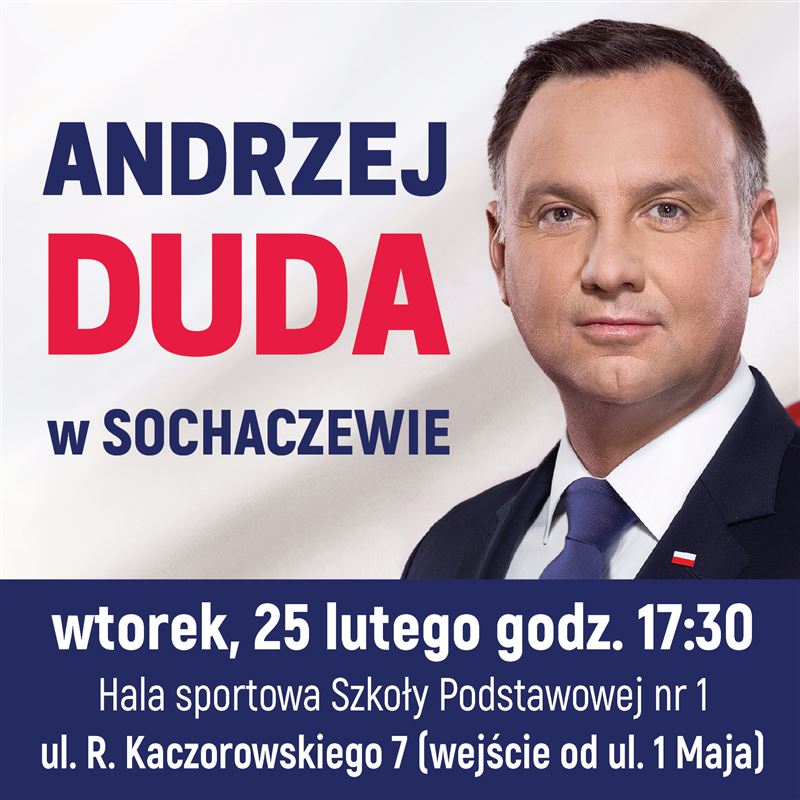 Prezydent Andrzej Duda już po raz trzeci odwiedzi Sochaczew. Spotka się z mieszkańcami naszego powiatu we wtorek 25 lutego o godzinie 17.30 w hali sportowej przy Szkole Podstawowej nr 1 w Sochaczewie, ul. Prezydenta Ryszarda Kaczorowskiego 7 (wejście od ulicy 1 Maja)