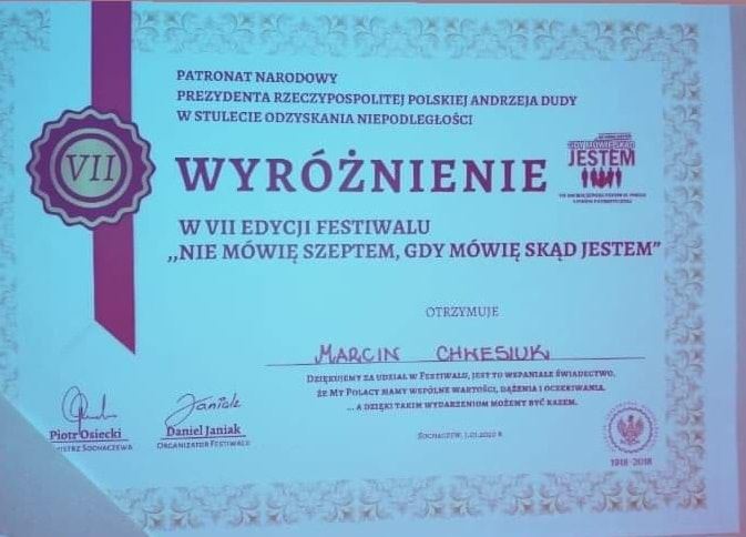 Każdego roku wychowankowie Placówki Opiekuńczo-Wychowawczej w Giżycach biorą udział w przepięknej lekcji historii, jaką jest udział w festiwalu „Nie mówię szeptem, gdy mówię skąd jestem", organizowanym z dużym rozmachem z inicjatywy przyjaciela naszego Domu - Daniela Janiaka. W tym roku wyróżnienie otrzymał nasz wychowanek Marcin Chwesiuk za wykonanie pieśni patriotycznej pt. „Widziałem ja orła na niebie”. Jesteśmy dumni i składamy serdeczne gratulacje Marcinowi, jak i wszystkim uczestnikom oraz podziękowania dla Weroniki Reszczyńskiej za ogromny wkład w przygotowanie do konkursu.