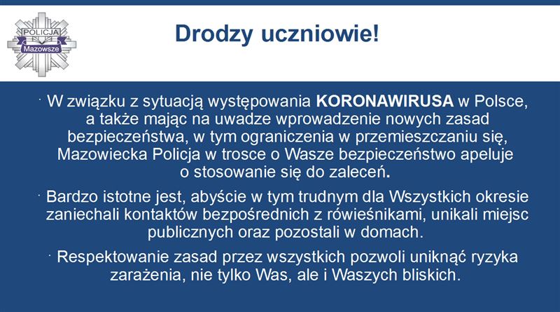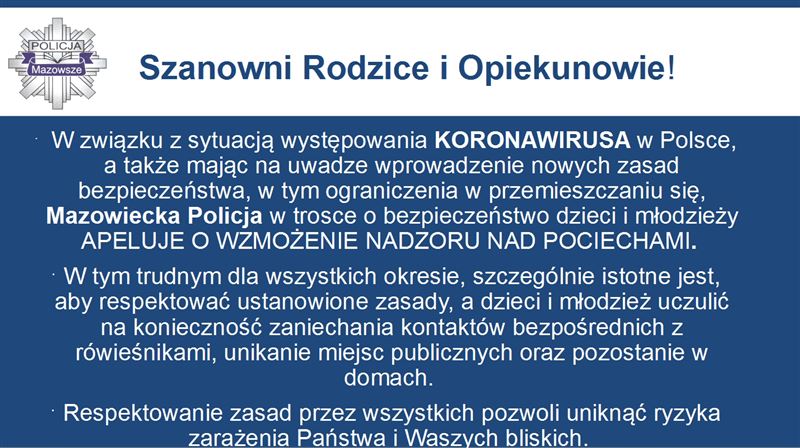 W związku z wprowadzeniem stanu zagrożenia epidemicznego, zamknięcie szkolnych placówek oświatowych ma na uwadze ograniczenie rozprzestrzeniania się koronawirusa, a zaleceniem dla dzieci oraz młodzieży jest przede wszystkim unikanie skupisk ludzi. Mimo zaleceń wielu młodych ludzi ich nie przestrzega. Apel ma na celu uczulenie rodziców i opiekunów, aby w tym czasie zwiększyli nadzór nad dziećmi i dopilnowali, aby wytyczne związane z bezpieczeństwem epidemicznym były respektowane. Z kolei do dzieci apelujemy o stosowanie się do zaleceń, w szczególności zaniechanie kontaktów bezpośrednich z rówieśnikami, unikanie miejsc publicznych oraz pozostanie w domach.