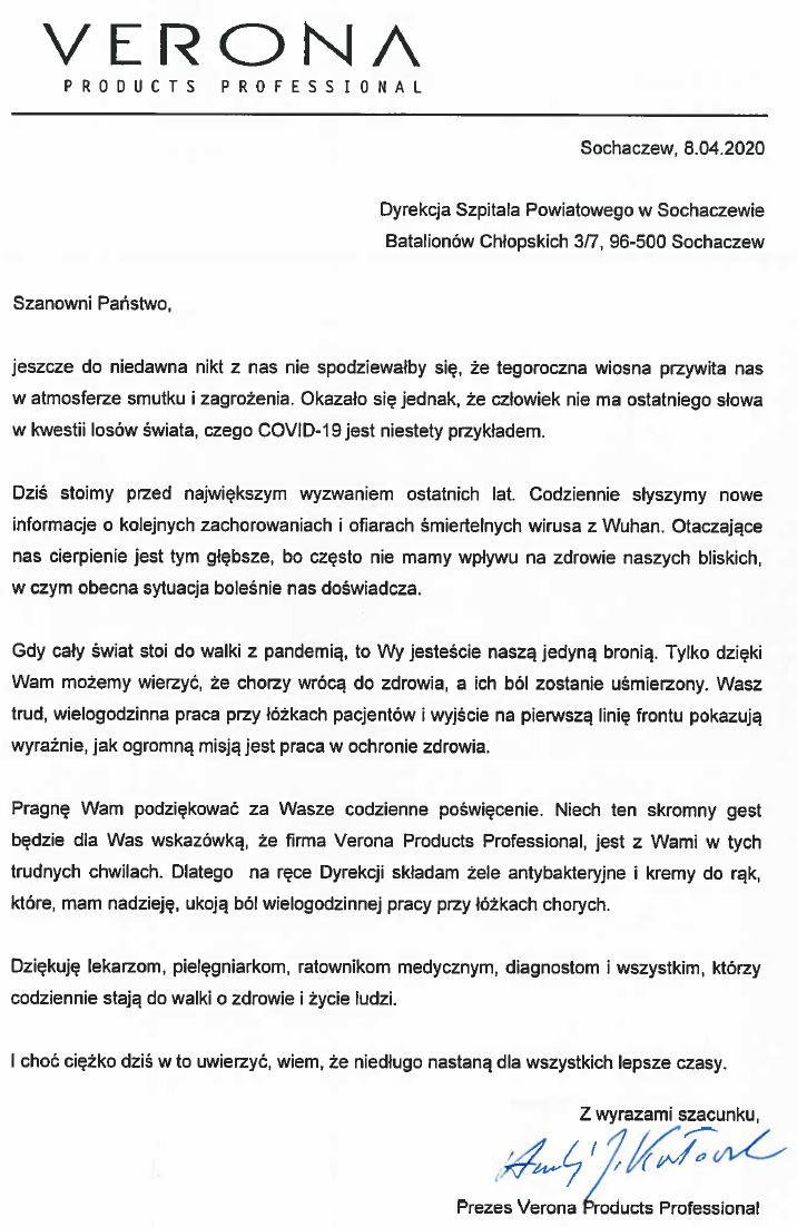 Bardzo dziękujemy za nieodpłatne przekazanie żelu antywirusowego do dezynfekcji rąk HAND SANITISING GEL. Skład żelu spełnia wymagania dla preparatów wirusobójczych, ponieważ w skład wchodzi 70% alkohol etylowy wzbogacony w kwas hialuronowy i glicerynę, aby nie podrażniał i nie wysuszał skóry. Personel medyczny, który używa już żelu firmy Verona twierdzi, że jest jednym z lepszych obecnie dostępnych na rynku.
