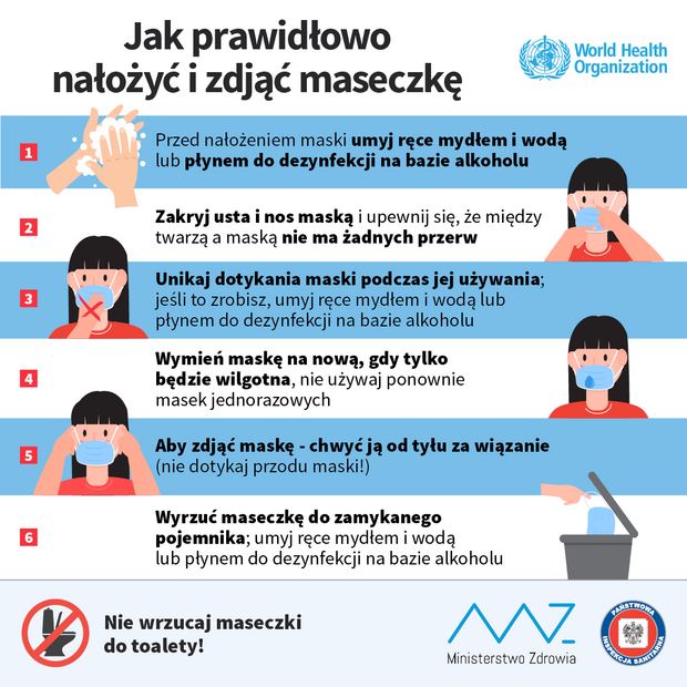 Projekt Rozporządzenia Rady Ministrów w sprawie ustanowienia określonych ograniczeń, nakazów i zakazów w związku z wystąpieniem stanu epidemii wskazuje na konkretne sytuacje, w których obowiązek zakrywania ust i nosa obowiązuje, a także wskazuje na odstępstwa od tego obowiązku. Maseczki trzeba nosić w środkach publicznego transportu zbiorowego, czyli w autobusach, tramwajach, trolejbusach, pociągach. Obowiązek zakrywania ust i nosa obowiązuje, jeśli poruszamy się samochodem z osobą, z którą, na co dzień nie mieszkamy lub nie gospodarujemy wspólnie. Obowiązek dotyczy również osób poruszających się rowerem, motocyklem, skuterem, hulajnogą, pieszo. Mamy obowiązek zakrywania ust i nosa, gdy znajdujemy się na drogach, w parkach, zieleńcach, na promenadach, bulwarach, w ogrodach botanicznych, zoologicznych, jordanowskich i zabytkowych, a także na plażach. Obowiązek będzie istniał także podczas przebywania na terenach leśnych, w szczególności na terenie parkingów leśnych, miejsc postoju pojazdów, edukacji leśnej, małej infrastruktury leśnej i biwakowania. Noszenie maseczki obowiązuje także w budynkach użyteczności publicznej przeznaczonych na potrzeby: administracji publicznej, wymiaru sprawiedliwości, kultury, kultu religijnego, oświaty, szkolnictwa wyższego, nauki, wychowania, opieki zdrowotnej, społecznej lub socjalnej, obsługi bankowej, handlu, gastronomii, usług, w tym usług pocztowych lub telekomunikacyjnych, turystyki, sportu, obsługi pasażerów w transporcie kolejowym, drogowym, lotniczym, morskim lub wodnym śródlądowym. Noszenie maseczek jest obowiązkowe we wszystkich obiektach handlowych (sklepach, galeriach itp.) i usługowych (zakłady fryzjerskie, zakłady kosmetyczne itp.) oraz na targowiskach. Zakrywać nos i usta trzeba też na terenie nieruchomości wspólnych (chodzi np.: o części wspólne budynków wielorodzinnych: klatki schodowe, windy, pralnie itp.).