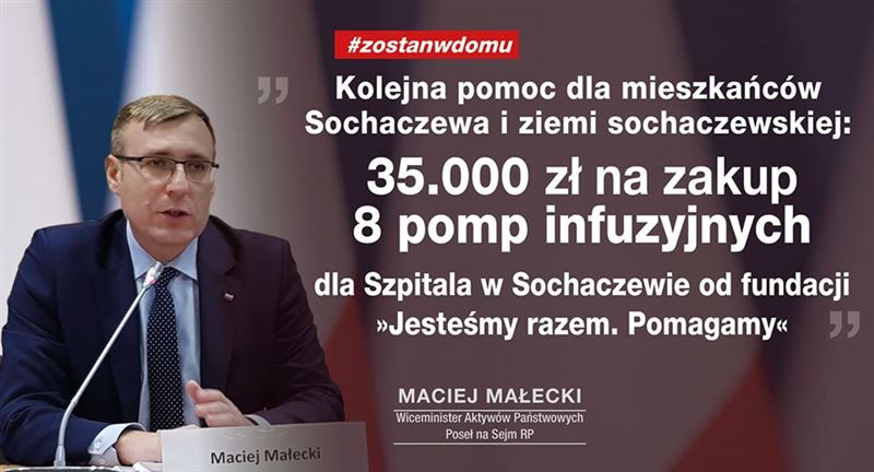 Epidemia koronawirusa to zagrożenie zdrowotne dla nas wszystkich. Jakże ważna jest więc wspólna pomoc w zabezpieczeniu przed niebezpieczeństwem dalszego rozprzestrzeniania się COVID-19. Dziś, każdy przyrząd medyczny, lek, środki ochrony itp. są jeszcze bardziej potrzebne niż dotąd. Nie pierwszy już raz z pomocną ręką dla mieszkańców ziemi sochaczewskiej wychodzi poseł Maciej Małecki, wiceminister w Ministerstwie Aktywów Państwowych. Tym razem, dzięki jego zaangażowaniu Szpital Powiatowy w Sochaczewie otrzyma od fundacji „Jesteśmy razem. Pomagamy” kwotę 35 tys. zł na zakup ośmiu pomp infuzyjnych. Inicjatywa „Jesteśmy Razem. Pomagamy” powstała w odpowiedzi na palące problemy, z jakimi borykają się polskie szpitale i inne organizacje, walczące z pandemią SARS-CoV-2. W ramach akcji jednoczą się polskie przedsiębiorstwa, osoby prywatne, fundacje, kancelarie prawne, a także inne podmioty, które w jakikolwiek sposób mogą pomóc w walce z wirusem. Pompy infuzyjne stosowane są tam, gdzie szczególnie precyzyjna podaż leków jest podstawowym i niezbędnym elementem leczenia. Jest urządzeniem medycznym, który umożliwia ciągłe lub cykliczne i bardzo dokładne dawkowanie zadanego leku. Tym bardziej dziękujemy!