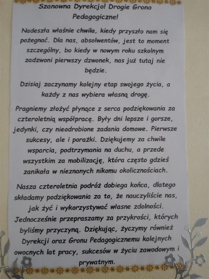 Dyrektor Ewa Odolczyk w imieniu rady pedagogicznej pogratulowała ukończenia szkoły, skierowała do absolwentów ciepła słowa, aby trzymali się mocno, mimo trudnego czasu, życzyła powodzenia w życiu osobistym, zawodowym , a także sukcesów na egzaminach maturalnym i zawodowym. Za pośrednictwem kończących szkołę przekazała listownie podziękowania rodzicom za współpracę oraz efektywną pomoc w kształtowaniu młodego pokolenia.