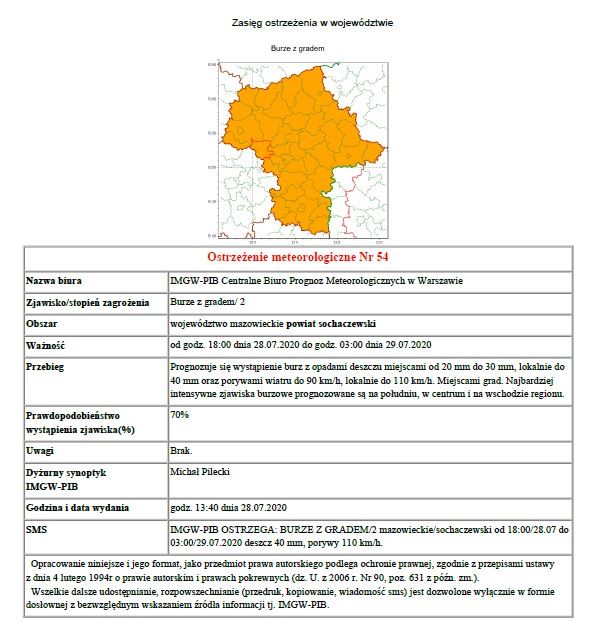 Centralne Biuro Prognoz Meteorologicznych w Warszawie ostrzega mieszkańców powiatu sochaczewskiego, przed wystąpieniem dziś (28.07) od godz. 18:00 do godz. 3:00 w nocy burz z gradem.