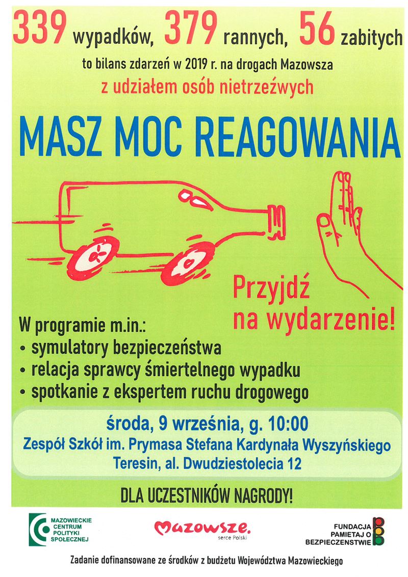 Zespół Szkół im. Stefana Kardynała Wyszyńskiego w Teresinie serdecznie zaprasza na bardzo ciekawe wydarzenie pod hasłem „MASZ MOC REAGOWANIA”. Odbędzie się ono w środę, 9 września w siedzibie teresińskiej szkoły przy al. XX-lecia 12. Start o godz. 10.00.