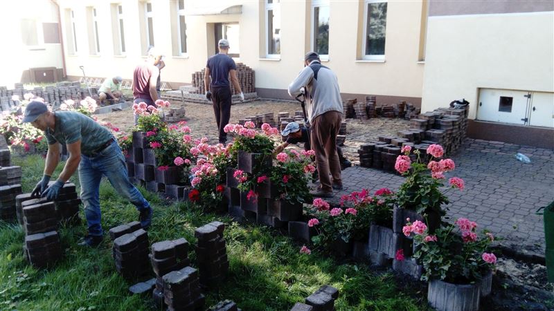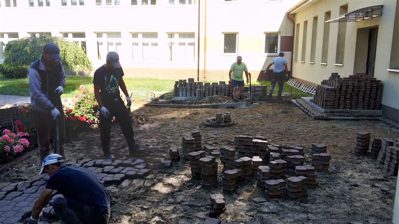 Było to możliwe dzięki staraniom dyrektora szkoły Marka Wernickiego, aby w zamian za korzystanie z fragmentu placu po byłym gospodarstwie, firma brukarska wykonała taki remont. Zarząd Powiatu, działający w imieniu właściciela gruntu, czyli Powiatu Sochaczewskiego, zgodził się na to rozwiązanie. Wartość świadczenia wzajemnego wyniosła około 31 tys. złotych. Prace polegały na rozebraniu starych chodników, ponownym osadzeniu krawężników, uzupełnieniu i zagęszczeniu podbudowy i ponownym ułożeniu kostki brukowej na powierzchni 286 m².